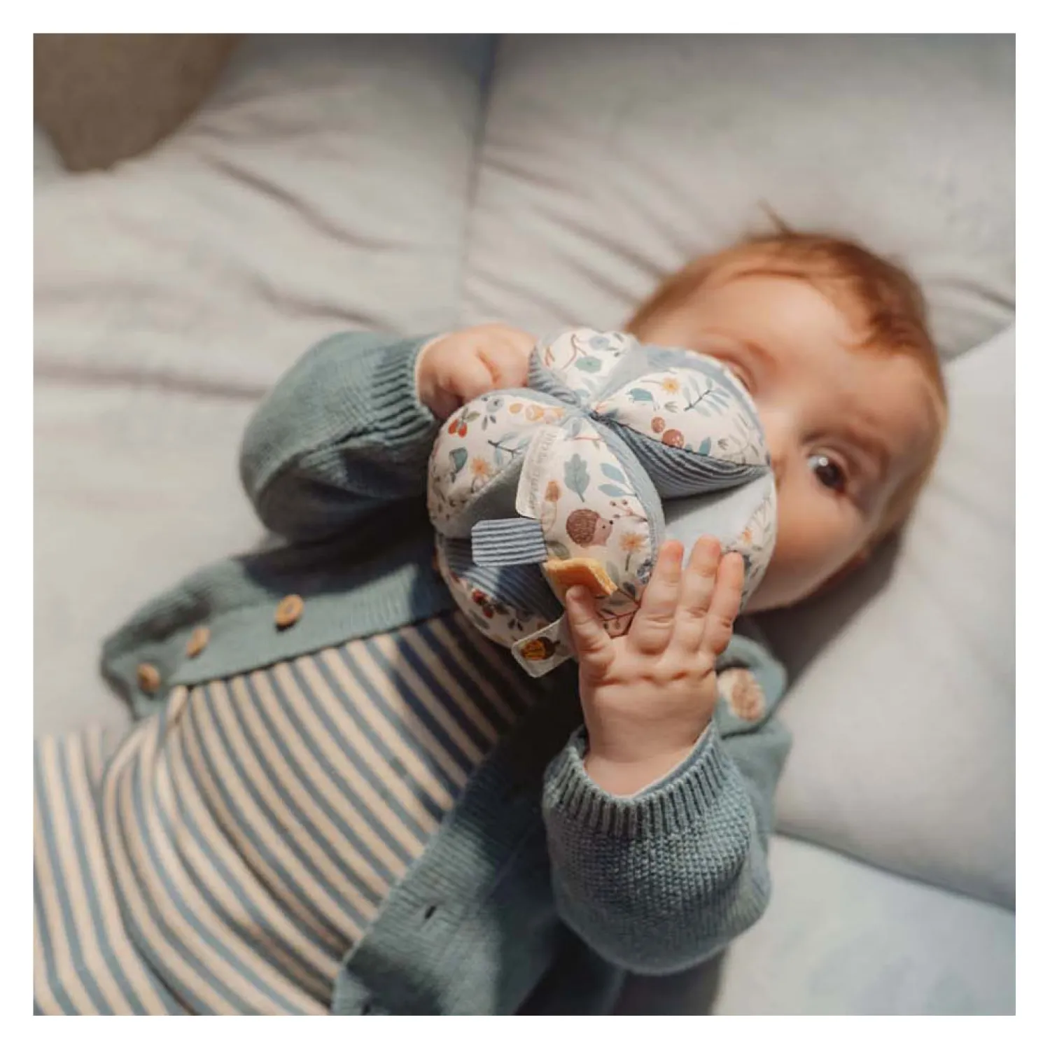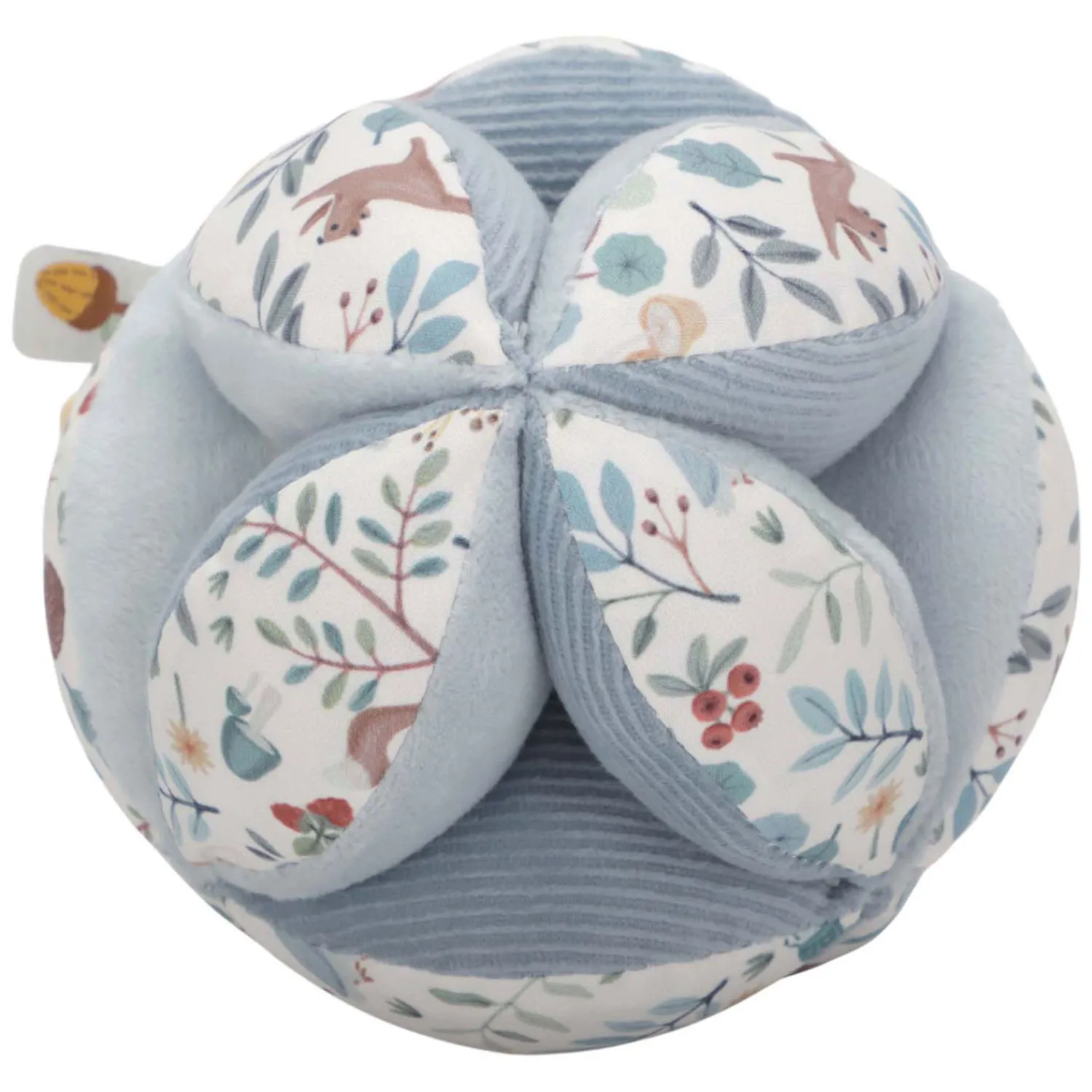 Probeer de bal maar te pakken! Deze grijpbal met zijn interessante vorm zorgt voor een geweldige uitdaging voor je kleintje. De vlakken van verschillende texturen en patronen nodigen uit om te grijpen en te verkennen. De bal is gemakkelijk op te pakken voor kleine handjes en het vrolijke geluid van het rammelende belletje beloont je baby’s inspanning. Op het mooie decor van Forest Friends zullen de makkelijk vast te pakken verschillende leuke labels de zintuigen prikkelen, grip ontwikkelen en je baby flink bezig houden in de box.