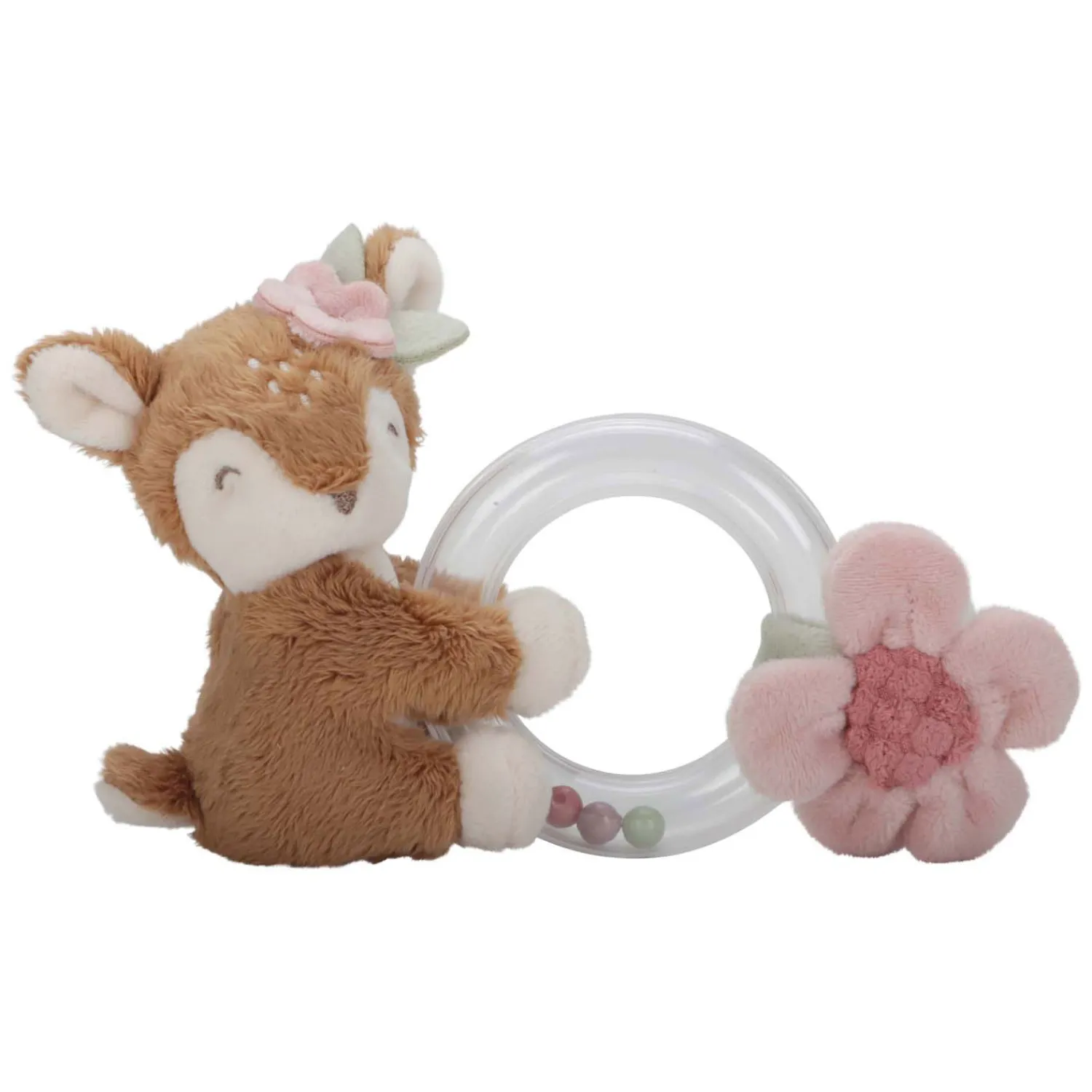 Grijp, draai en schud! Het lieve hertje met haar zachte vacht nodigt je uit om te spelen en deze ringrammelaar te laten horen. Het kleine bloemetje heeft ze speciaal voor jou geplukt om mee te kroelen. De transparante ring is gevuld met 3 kleine kraaltjes die rammelen als je kindje ermee speelt. Dit aantrekkelijke babyspeeltje prikkelt niet alleen je baby’s zintuigen en nieuwsgierigheid, maar bevordert ook de hand-oogcoördinatie.