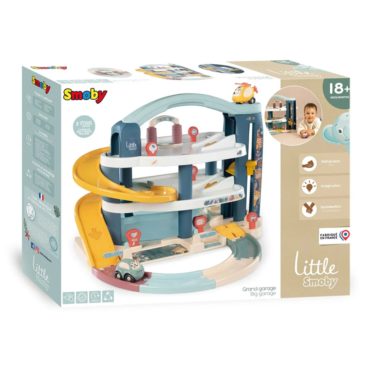 Bij de garage zitten twee voertuigen: één auto en één helikopter. Het totale formaat is 60 bij 62 bij 43 cm. Voor kinderen vanaf 18 maanden is het ideaal speelgoed waarbij ook de ontwikkeling positief gestimuleerd wordt. Hierbij kun je denken aan motorische ontwikkeling, samenspel en verbeelding. De hele set is in Frankrijk geproduceerd van duurzame materialen.