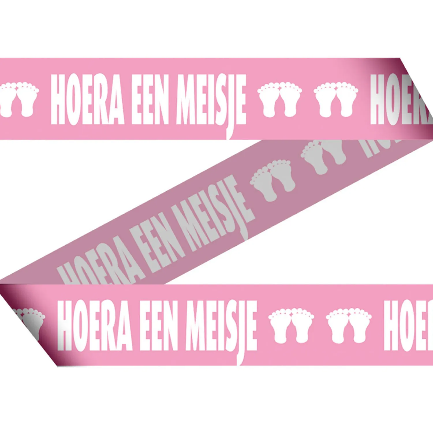 Roze afzetlint met voetjes en de tekst ‘hoera een meisje’. Ook leuk om als Cadeaulint te gebruiken.