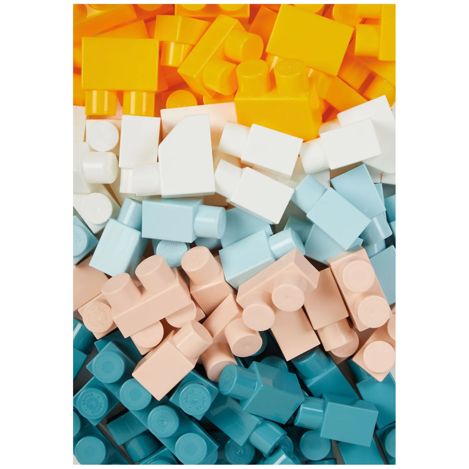 EEN GROTE PRAKTISCHE BOX: deze set bevat 1 transparante opbergbak met een deksel dat als basis dient voor de constructie en gevuld met 70 bouwstenen in verschillende kleuren en vormen.