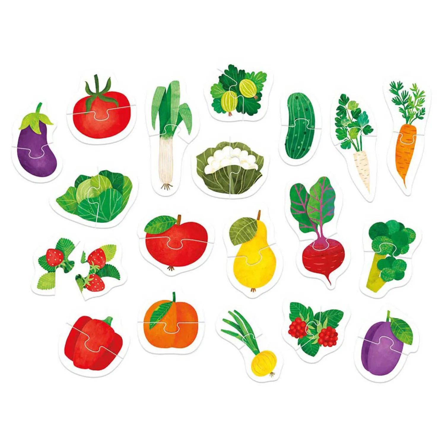 De Fruit- en Groentepuzzelset bevat 19 kleurrijke puzzels van twee stukjes! Veel plezier met eindeloze speelmogelijkheden: