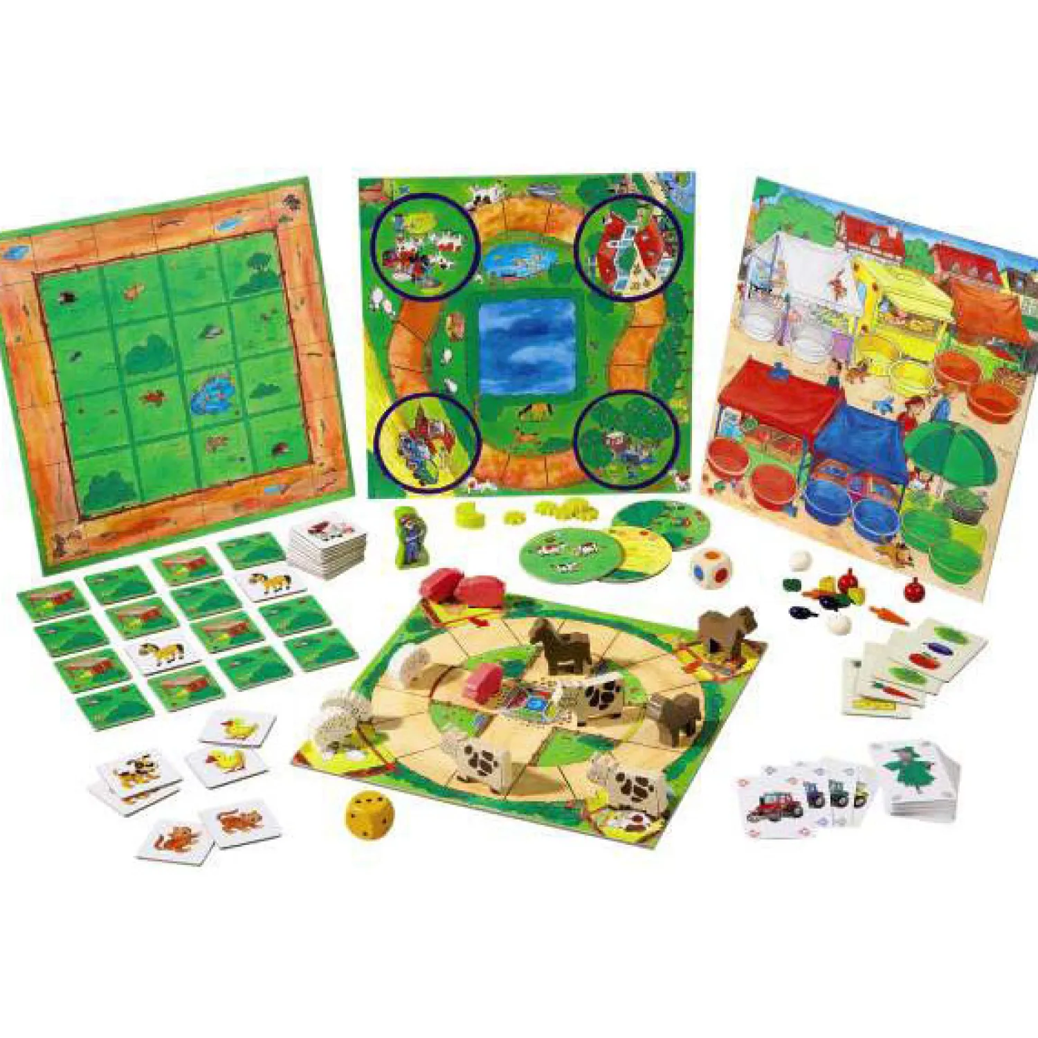 Inhoud: 3 paarden, 3 koeien, 3 varkens, 3 schapen, 2 rode appels, 2 pruimen, 2 eieren, 2 kaaspuntjes, 2 slablaadjes, 2 worteltjes, 1 boer, 1 ogendobbelsteen, 1 kleurendobbelsteen, 6 sterren, 1 maan, spelregels.
