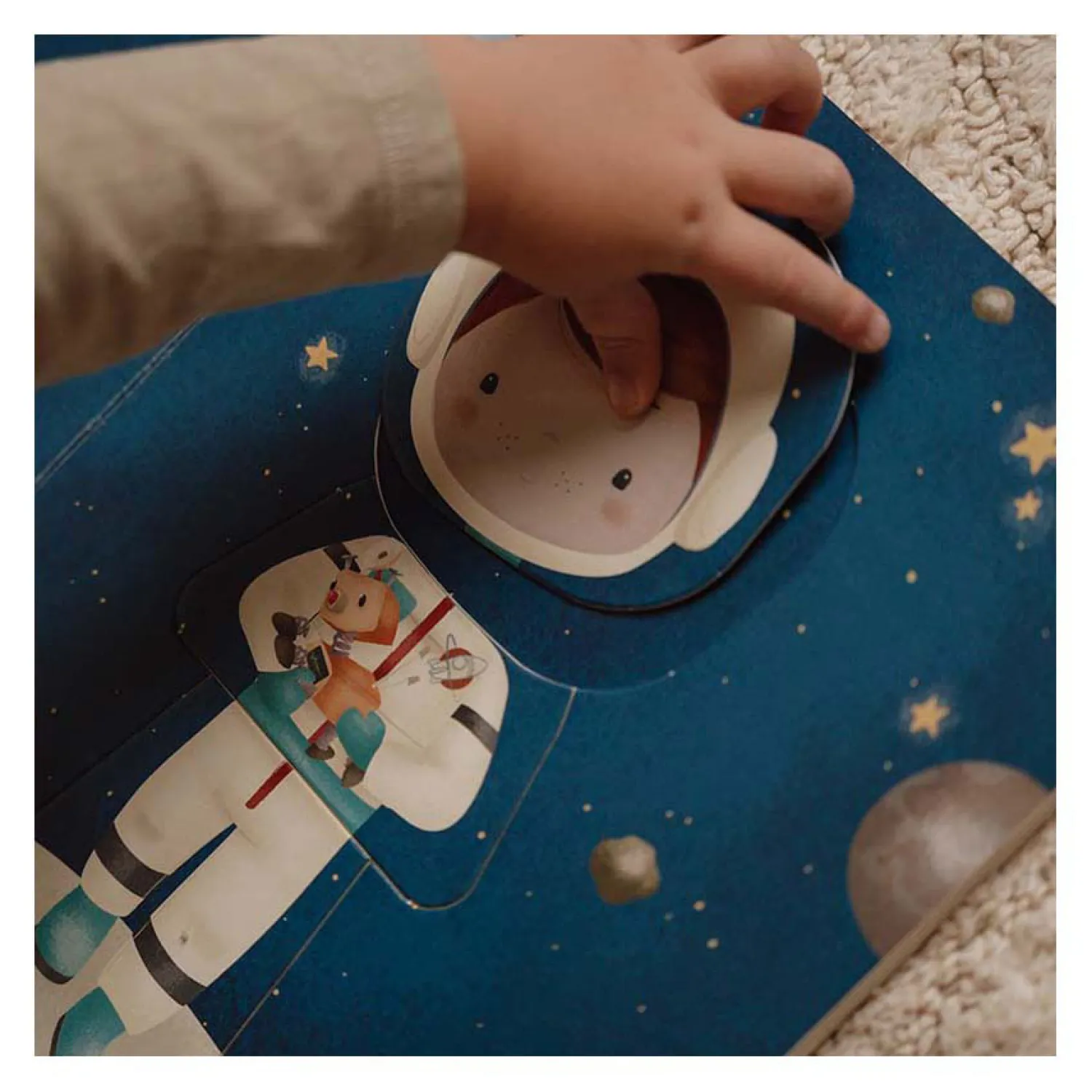 Dit stevige kartonboek staat vol met allerlei leuke beroepen. De duiker onderzoekt de zeebodem, de bloemist verkoopt mooie bloemen en de astronaut is met een raket naar de maan gevlogen. Wat wil jij later worden? De puzzelstukken kun je uit het boek halen en op tafel aan elkaar leggen. Leg ze terug op de goede plek of doe eens wat anders. Kan een brandweerman ook onder water? Of kijk eens of de dierenverzorger een duikpak past.