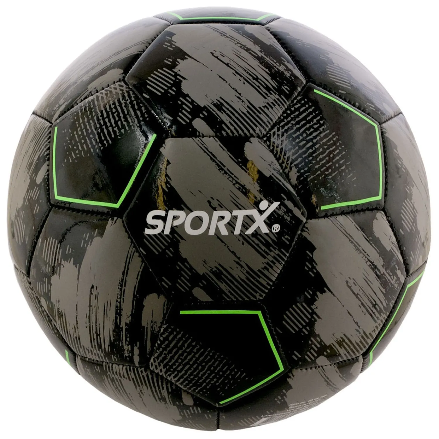 SportX Grey Black mini voetbal, in grijze kleurstelling met zwarte en neon groene accenten. Gewicht: 160-180 gram. Materiaal: super shiny pvc. Diameter: 16 cm. Dikte van de lagen: 2,7 mm. Wordt onopgeblazen geleverd.