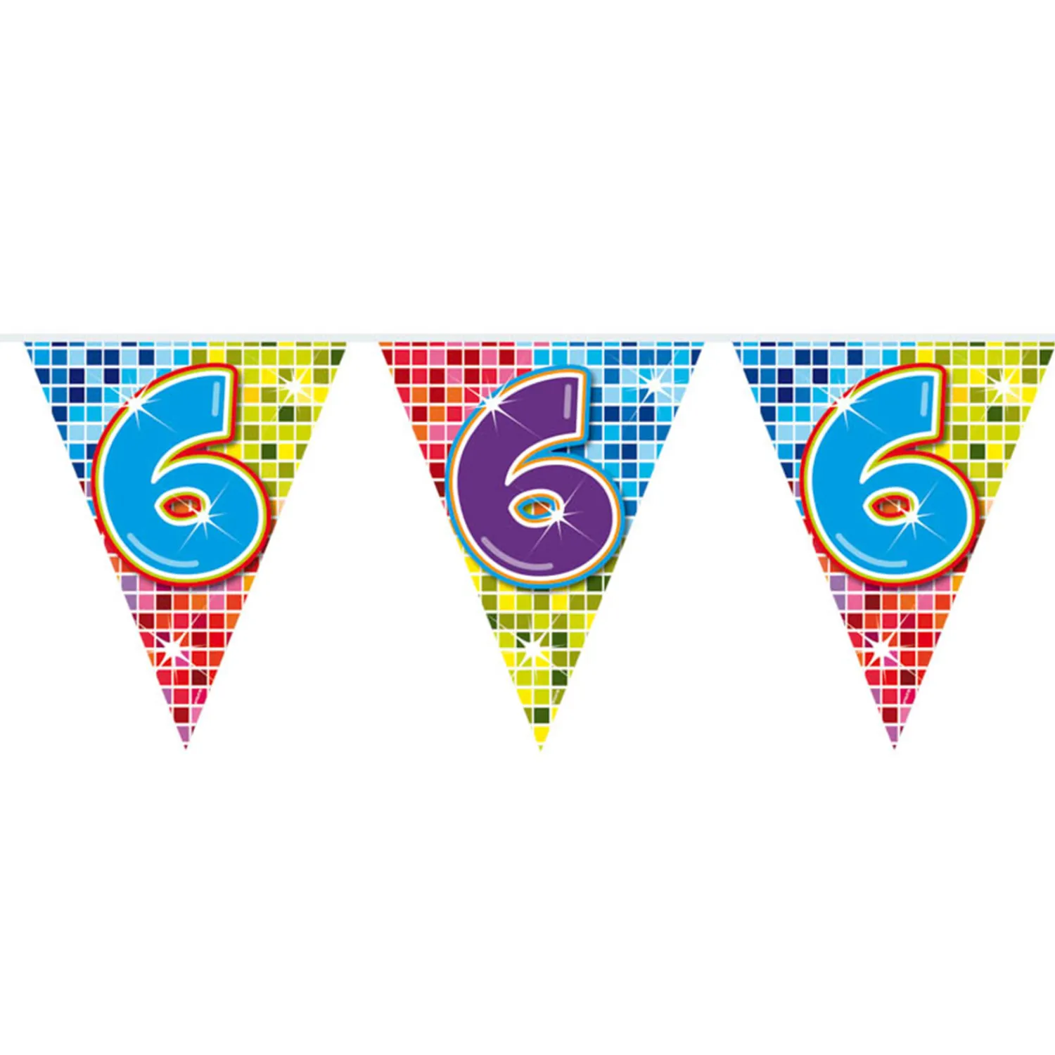 Wordt er iemand 6 jaar? Of vieren jullie een 6-jarig jubileum? Deze kleurrijke slinger staat perfect op ieder soort feestje! De slinger is enkelzijdig bedrukt, heeft 12 vlaggetjes en is 3 meter lang.