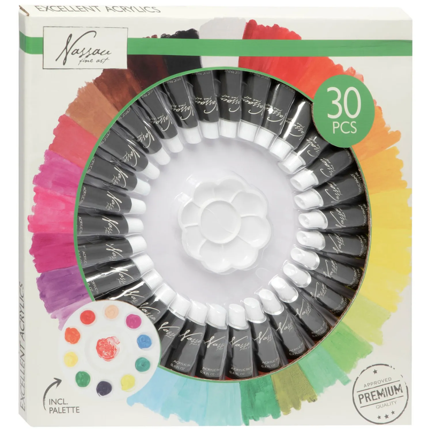 Nassau Fine Art acrylverf set met verfpalet. Inhoud: verfpalet en 30 verschillende kleuren (30 x 12 ml).