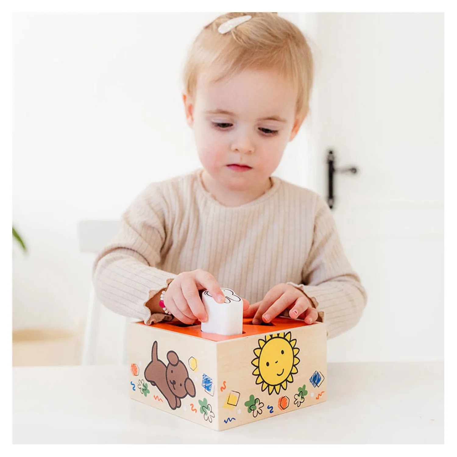 Gemaakt van stevig, duurzaam hout en geschikt voor kinderen vanaf 18 maanden oud. Afmetingen: 14 x 13,5 x 7,5 cm.