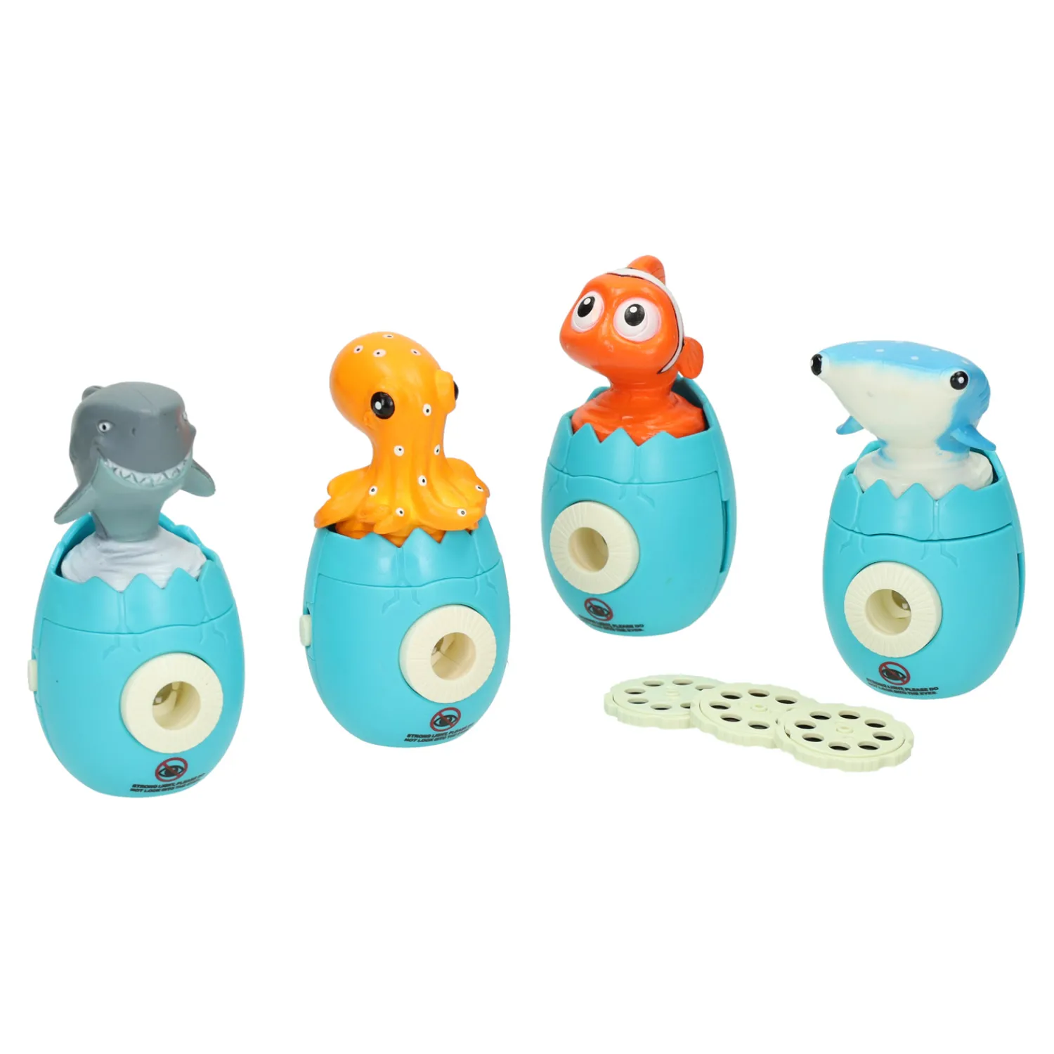 Inhoud: projector, 1 oceaandier in ei (de projector), 3 projectie schijfjes, lus om om je hand te doen.