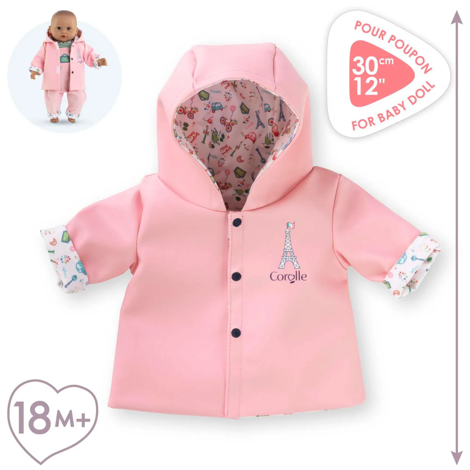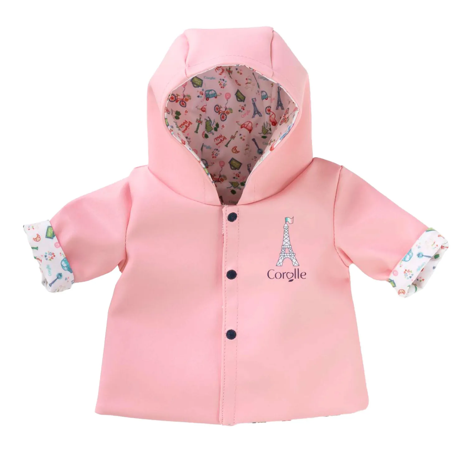 De regenjas is volledig omkeerbaar: jouw pop kan kiezen tussen een roze kant met Eiffeltorenprint of een kant met de exclusieve stof uit de Week-end à Paris-collectie.