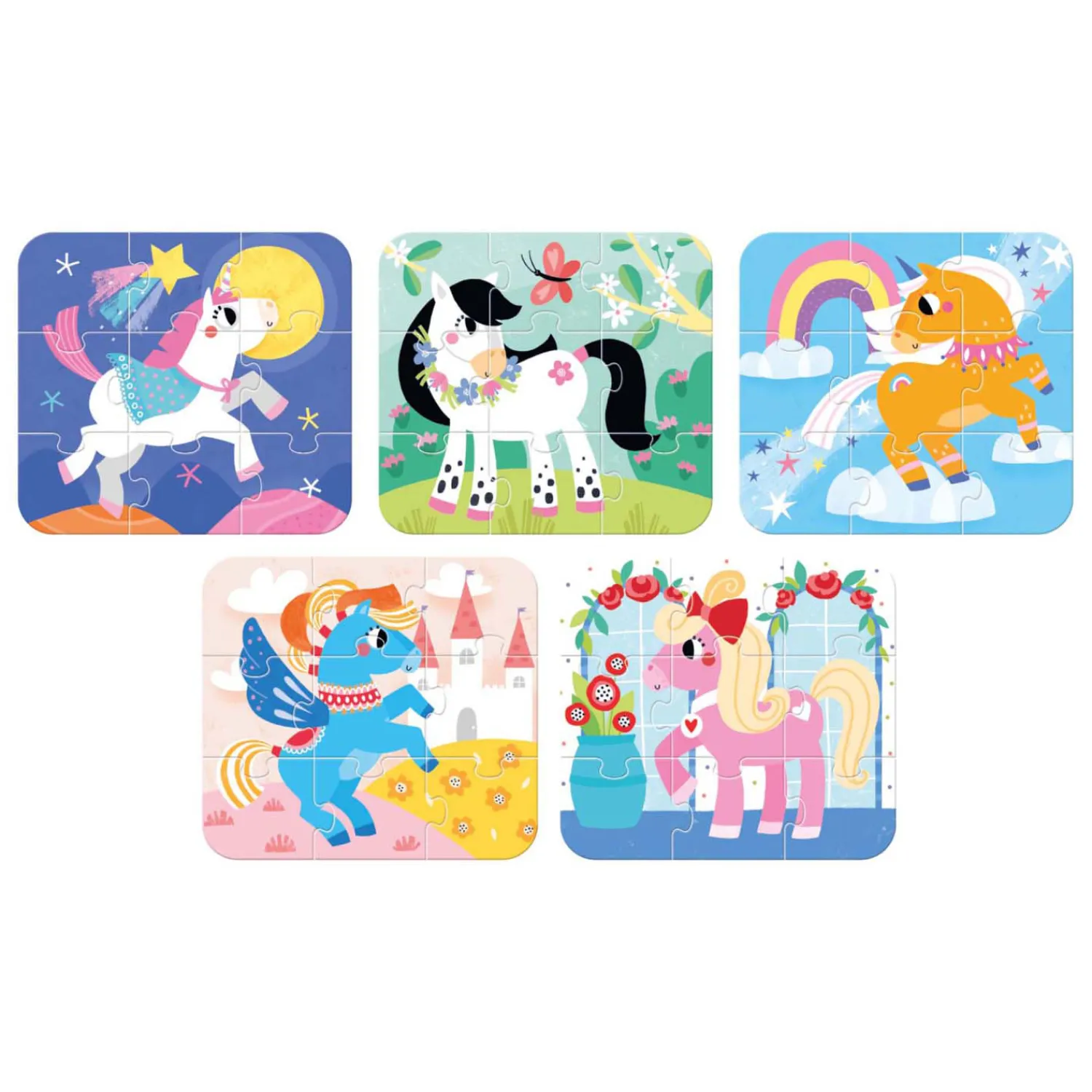 Het is tijd voor moeilijkere puzzels. Deze handige doos bevat 5 puzzels, elk bestaande uit 9 stukjes. De kleurrijke illustraties moedigen kinderen aan om de puzzel in elkaar te zetten, de perfecte manier om behendigheid en waarnemingsvermogen te ontwikkelen. Je kunt op veel manieren met deze puzzel spelen. Gebruik hem als inspiratie voor andere spellen, vertel je eigen verhalen of teken je eigen plaatjes.