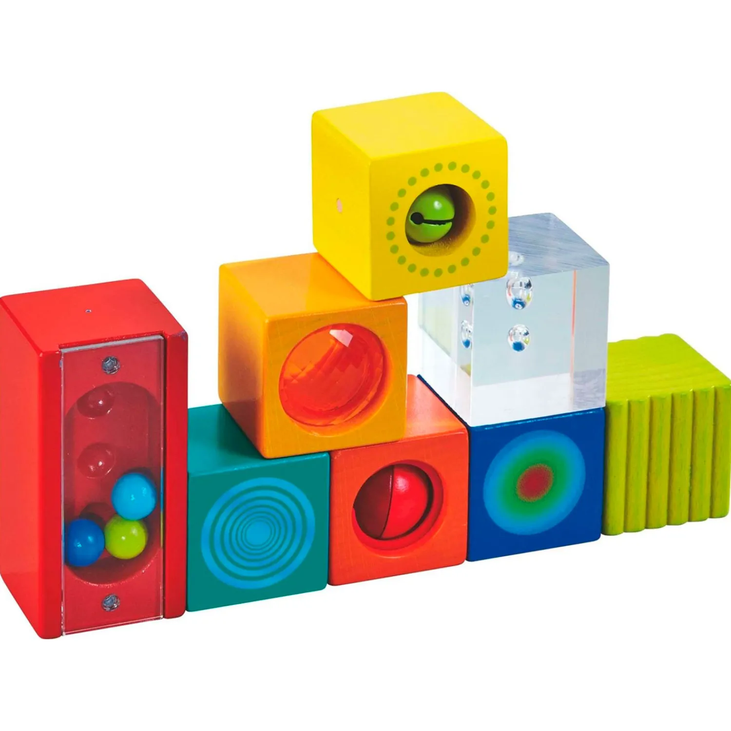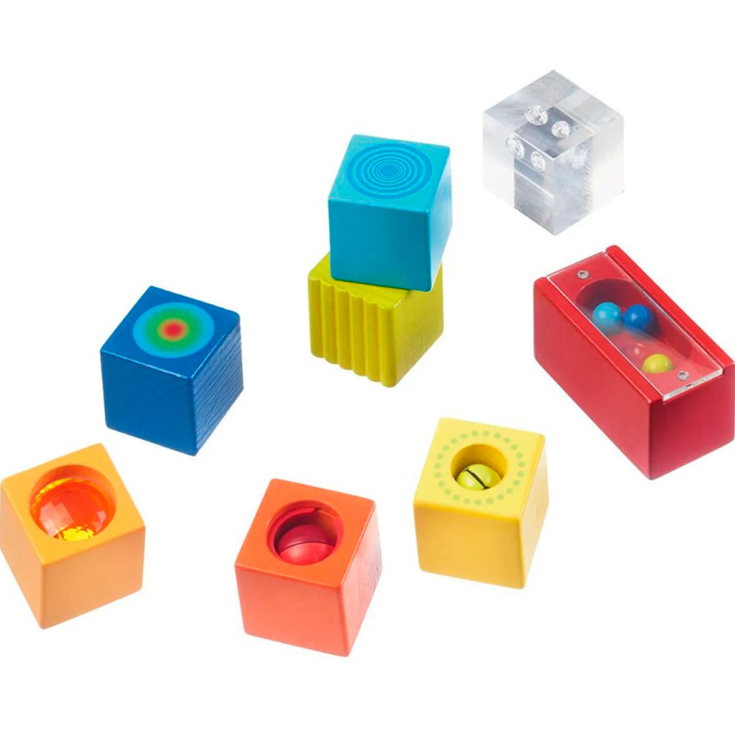 Een belletje, een rammelaar, een doorkijk, een knikkerspel … deze ontdekkersstenen bevatten veel effecten, die kinderen met al hun zintuigen kunnen onderzoeken. En natuurlijk kunnen met de ontdekkersstenen ook prachtige torentjes worden gebouwd. De set bestaat uit 8 blokken.