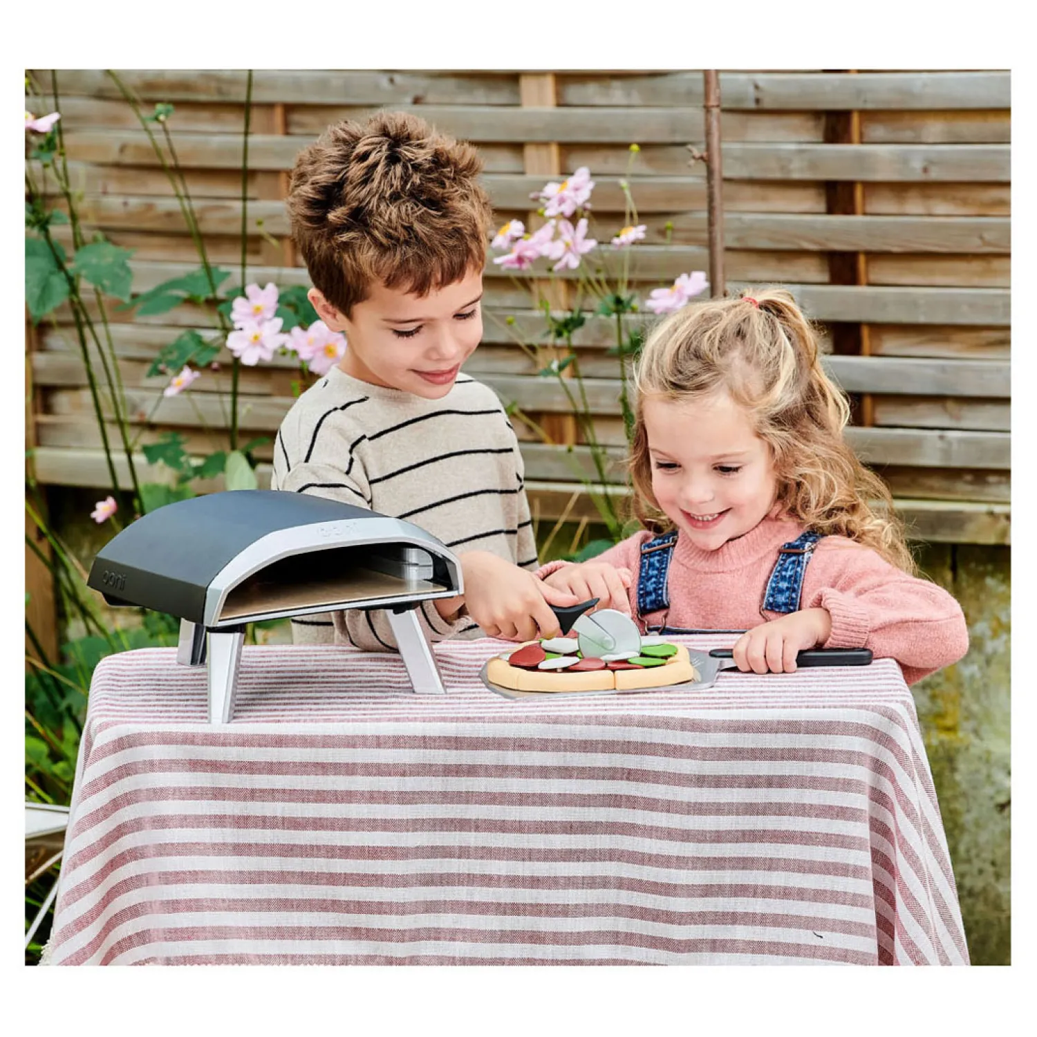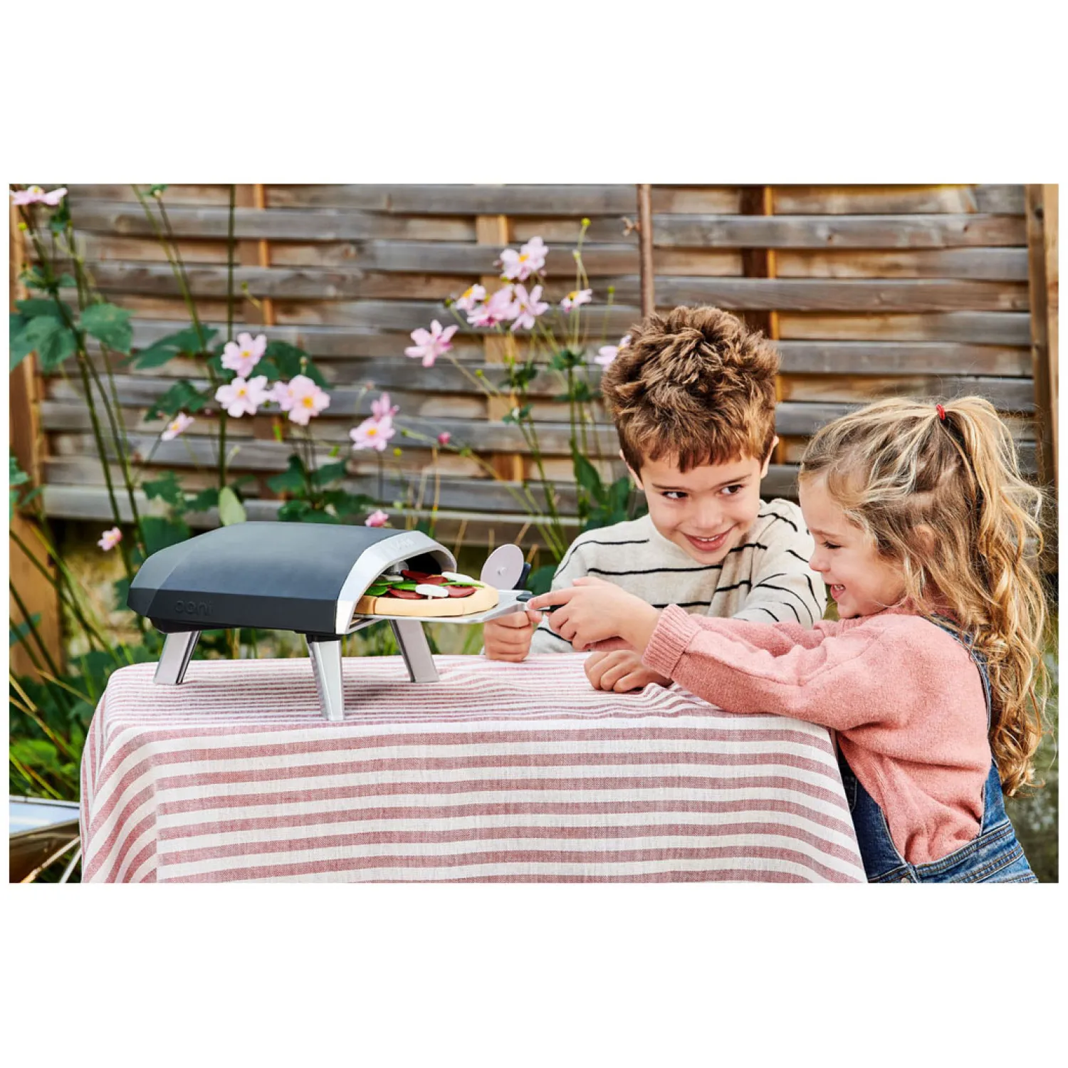 Inhoud: Ooni Koda pizzaoven, pizzaschep, pizzasnijwiel, ronde pizza met 6 plakjes, 3x toppings: mozzarella, pepperoni, basilicum (6 van elk) en verwijderbare stukjes saus.