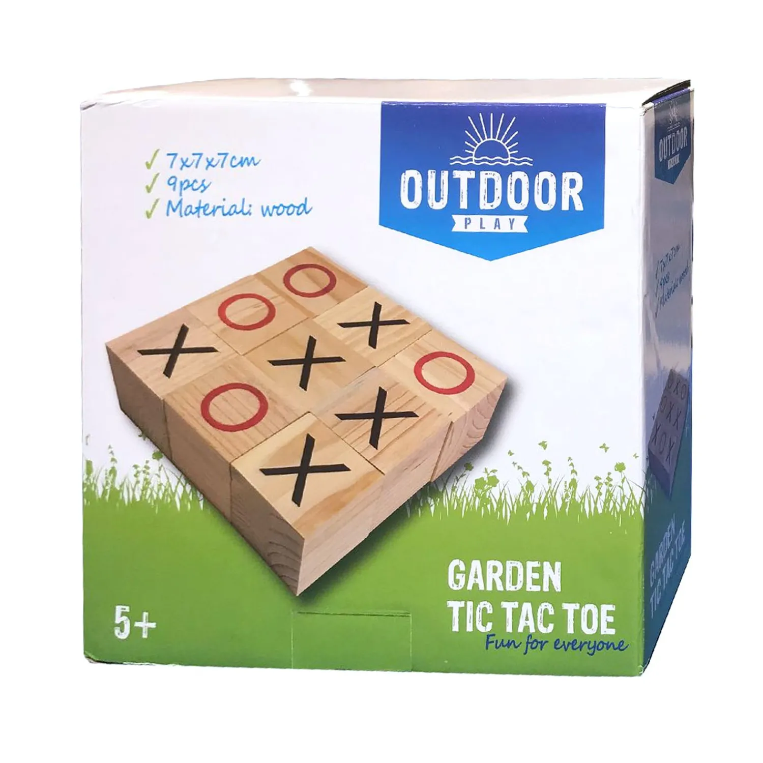 Inhoud: 9 houten blokken met rondjes en kruisjes afgebeeld.