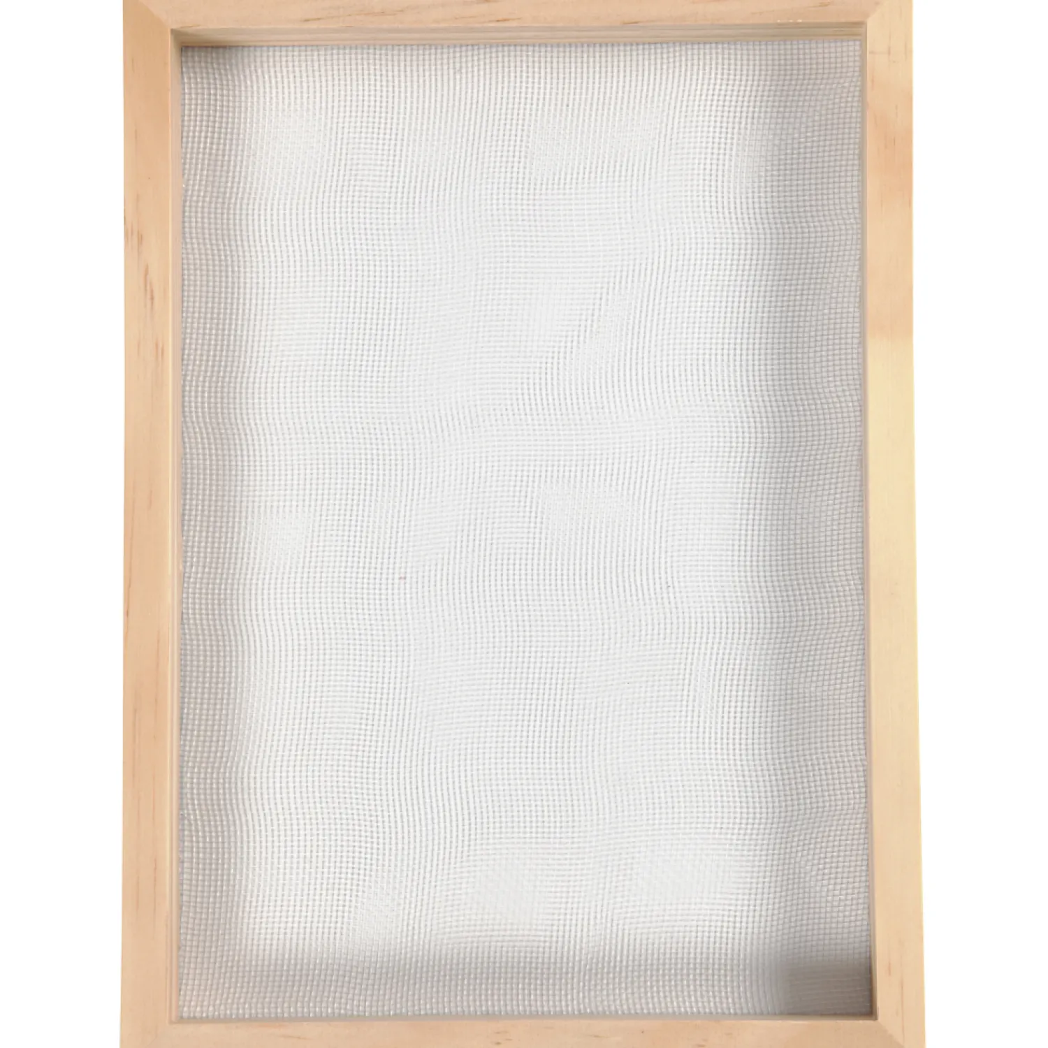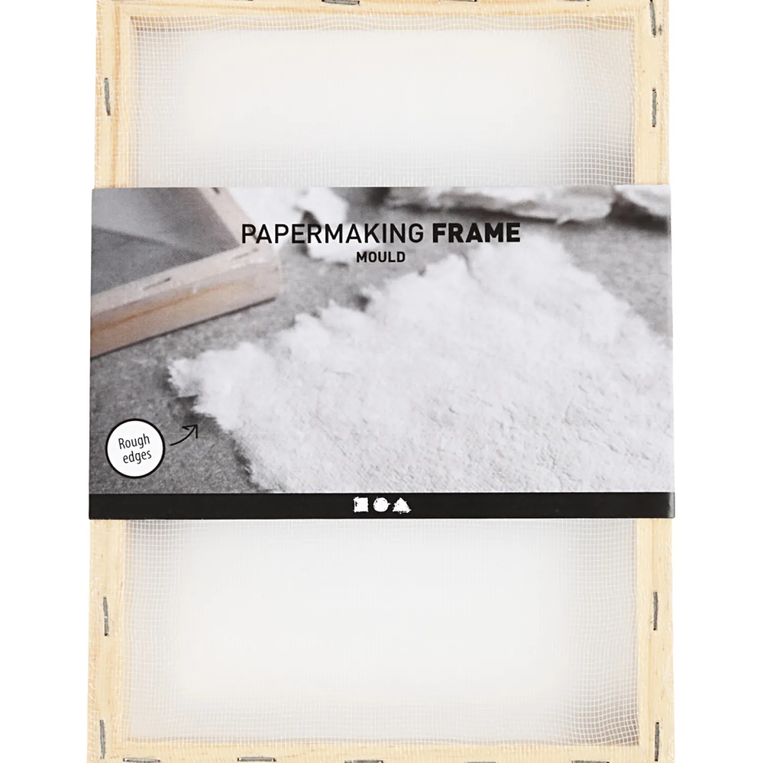 Papiermal met enkel frame om zelf papier te maken. Het grenen frame bestaat uit een mal en een omslag. Afmeting papiermal: A5-formaat (23x17x2 centimeter). De clips van de gietmal zijn gemaakt van roestvrij staal waardoor ze niet roesten in contact met water.