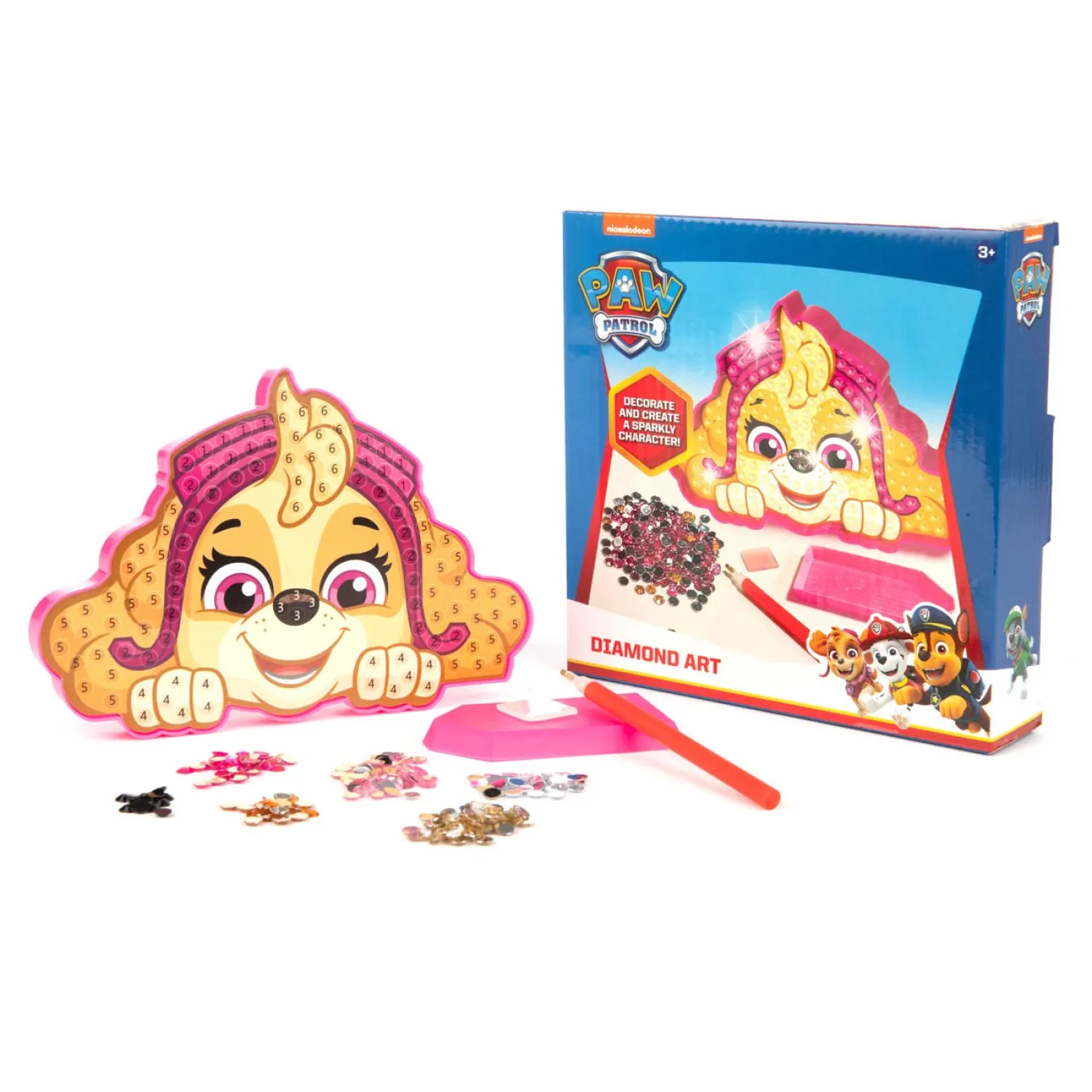 Inhoud: Skye-figuur, applicator pen, bakje, verschillende kleuren steentjes, instructies en lijmblokje. Niet geschikt voor kinderen onder de 3 jaar oud.