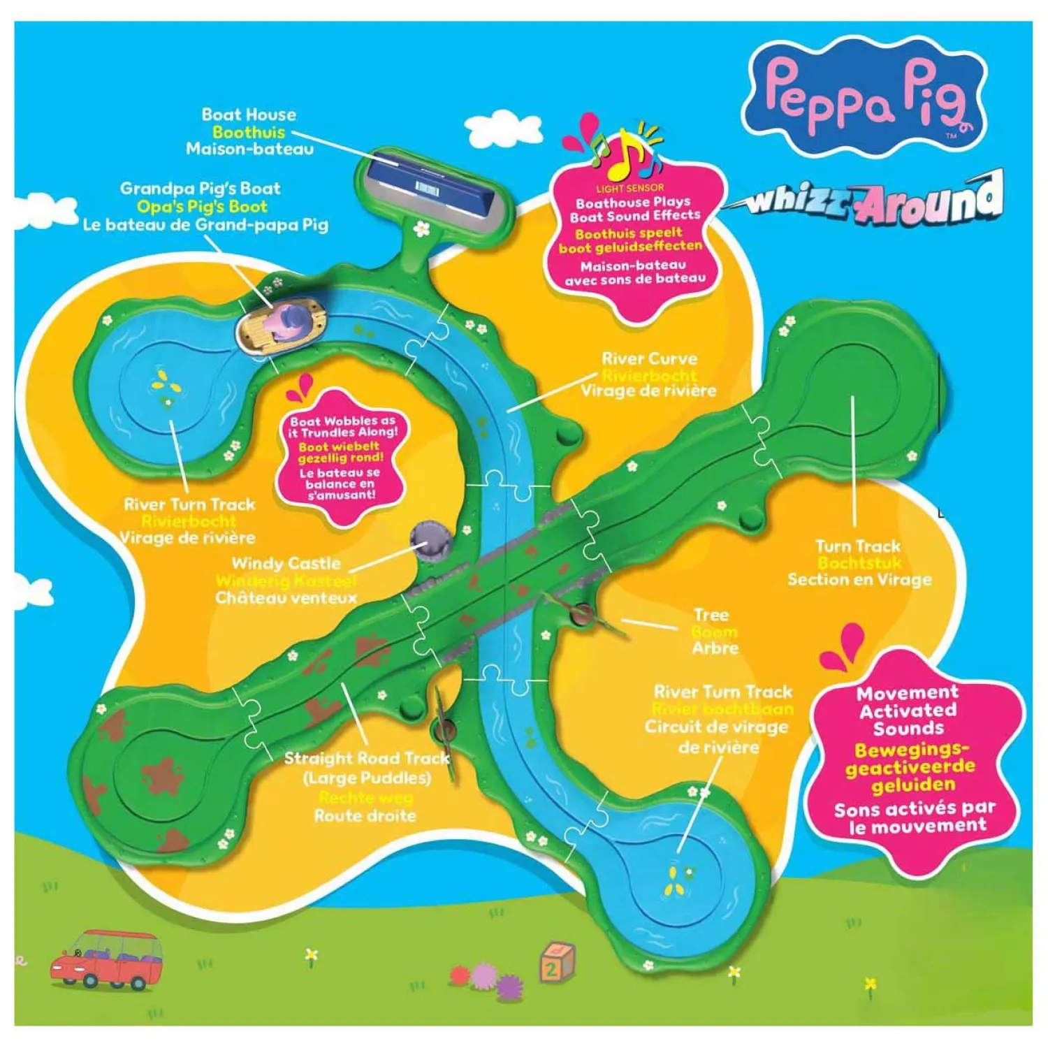 Deze set is perfect te combineren met andere Peppa Pig Whizz Around speelsets en de 5 Whizz Around voertuigen (los verkrijgbaar). Zo creëer je een steeds grotere wereld vol avontuur, vriendschap en plezier. Voor jonge Peppa-fans is dit dé ideale speelset: interactief, vrolijk en boordevol herkenbare elementen uit de serie. Leeftijdsindicatie: 2+ jaar.