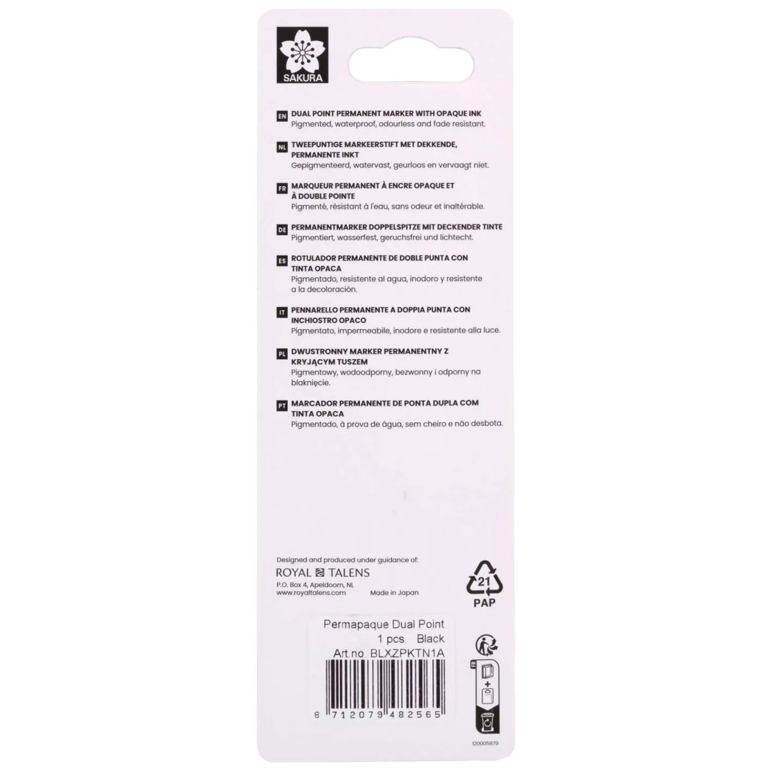 Sakura Permapaque is een unieke, universele permanente markeerstift met watergedragen pigmentinkt. Deze dekkende stift bevat twee punten: een fijne punt van 1 mm en een beitelpunt van 5,5 mm en hoeft niet geschud of gepompt te worden voor gebruik. Dankzij de speciale inkt garandeert Permapaque een permanente, dekkende afwerking.