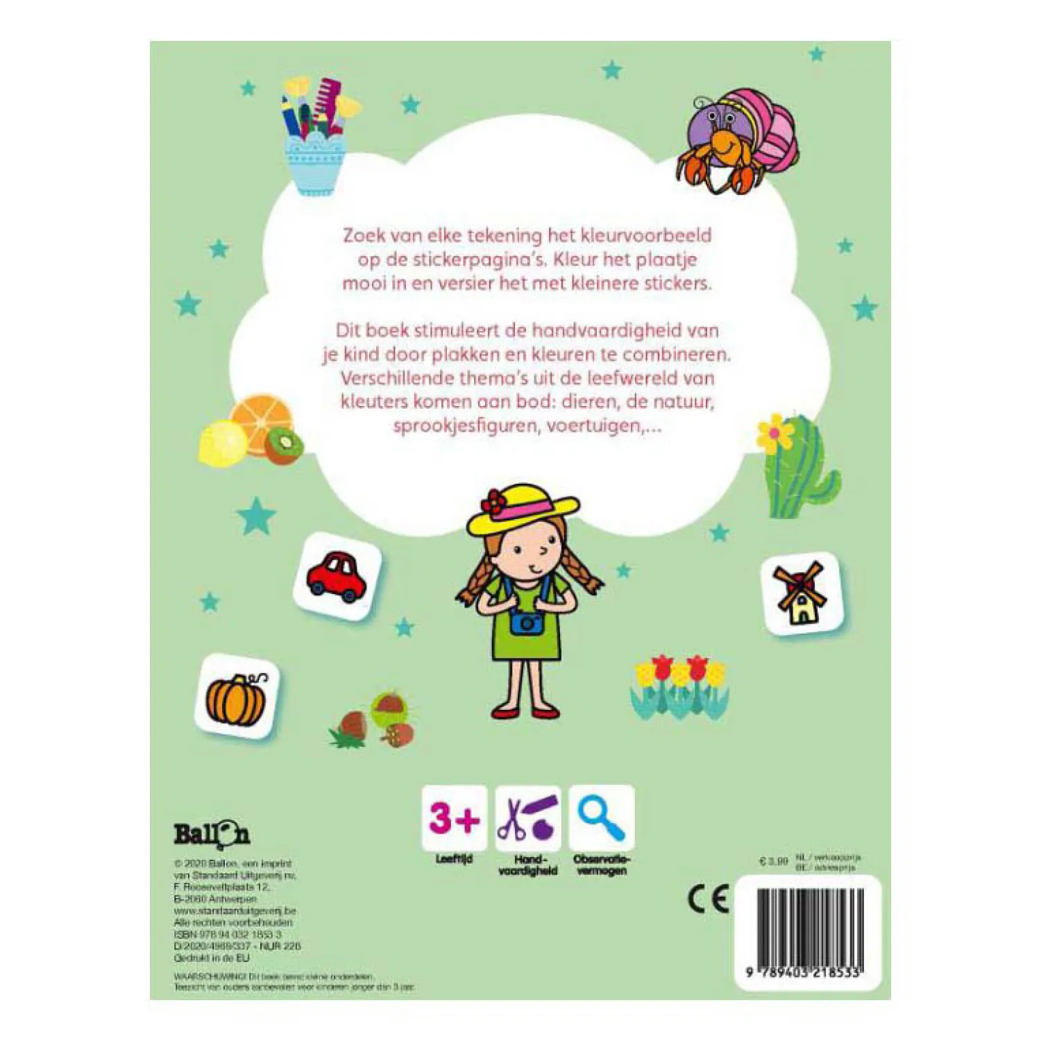 Dit boek stimuleert de handvaardigheid van je kind door plakken en kleuren te combineren. Verschillende thema’s uit de leefwereld van kleuters komen aan bod: dieren, de natuur, sprookjesfiguren, voertuigen,…