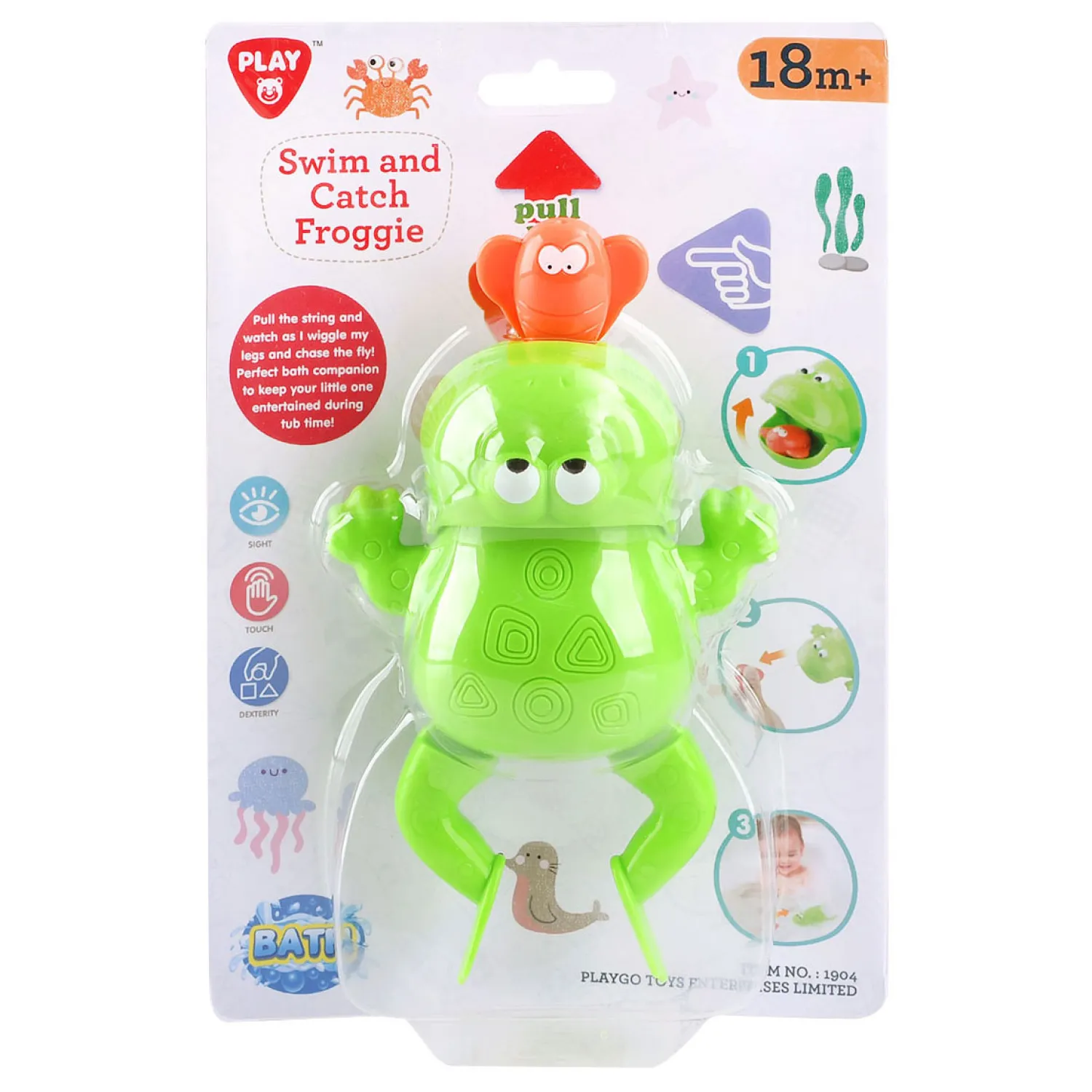 In bad gaan wordt altijd leuker en leuker voor je baby en peuter met dit schattige, mechanische speelgoed met een zwemmende kikker die een insect kan vangen en doorslikken. Een badspeeltje kan een leuke afleiding bieden voor uw jonge peuter en kan daarbij ook een sterkere band tussen kind en ouder creëren, vooral als de peuter afhankelijk is van de ouder om het speeltje op te winden of aan een touwtje te trekken om de interne mechanische veer te bedienen om het speelgoed laten bewegen. En als het kind aan het eind van de dag in bad gaat, kan het spelen in de badkuip extra energie verbruiken en ervoor zorgen dat het kind gemakkelijker slaapt. Deze Playgo Swim & Catch Froggie is een mechanisch speeltje dat in het water kan bewegen wanneer een insect dat aan een touwtje is vastgemaakt, wordt uitgetrokken. De interne mechanisme zorgt ervoor dat de voorpoten van Froggie peddelen en Froggie bewegen om het insect te vangen en in te slikken. Froggie zal een leuke badgenoot zijn voor uw jonge peuter. Geschikt voor kinderen van 18 maanden en ouder.