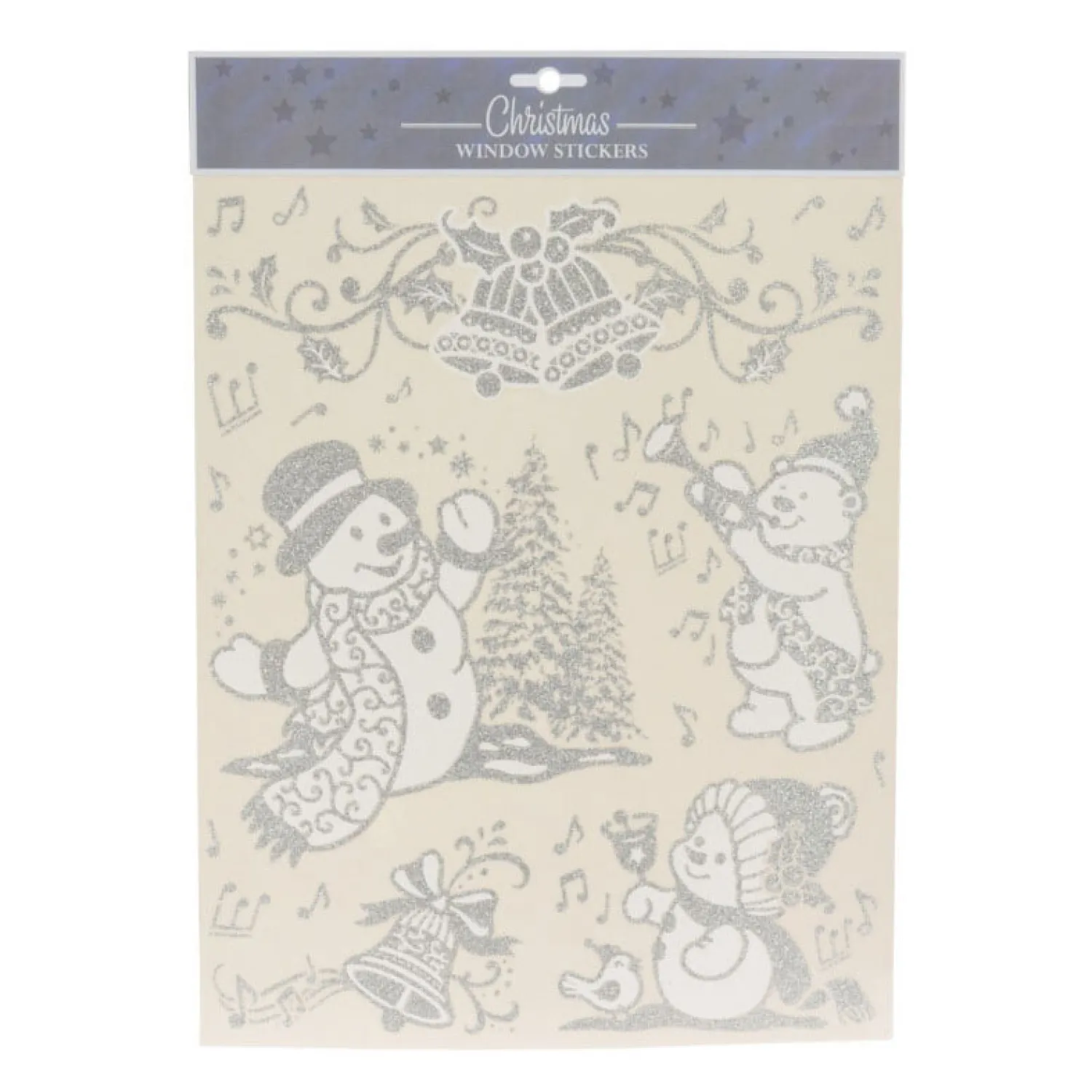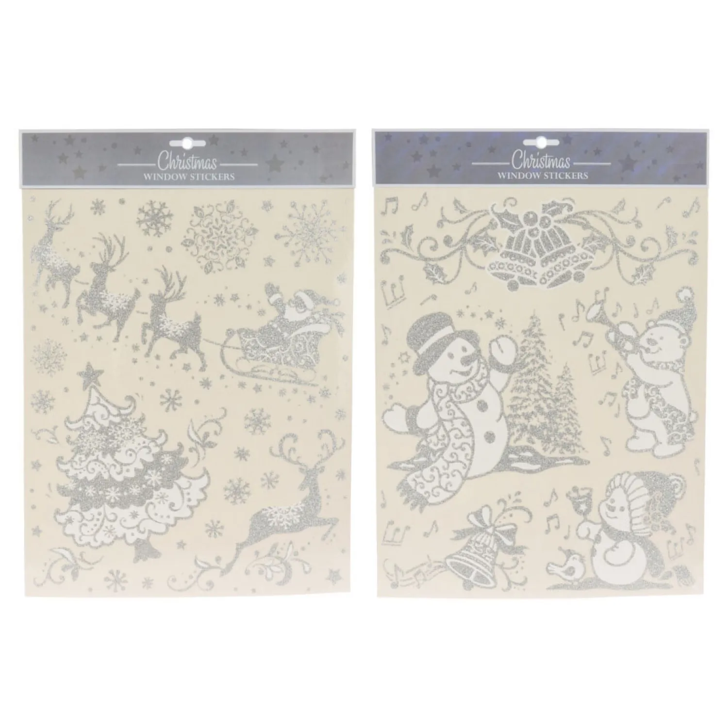 Zilveren raamstickers van met kerstfiguren en glitters. Verkrijgbaar in variant met sneeuwpop en beertjes en variant met arreslee en kerstboom. Afmetingen stickervel: 32 x 30 centimeter.Prijs per stuk, verschillende uitvoeringen/kleuren worden door elkaar geleverd.