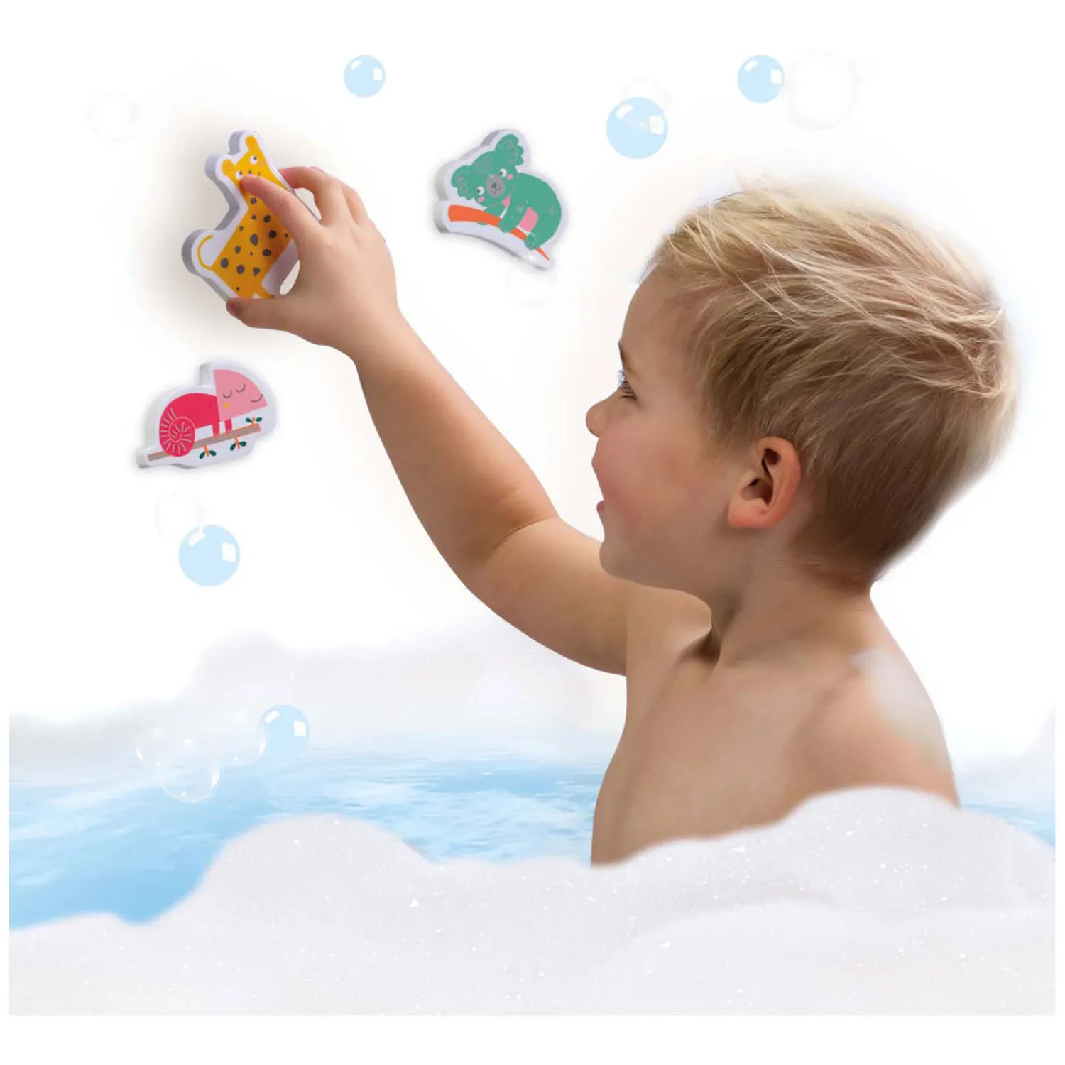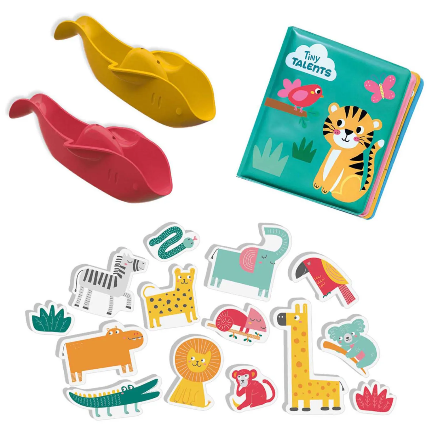 Maak van badtijd een feestje met de Bad speelset! De set bevat een leuk badboek met 8 bladzijden vol magische plaatjes die tevoorschijn komen wanneer je kindje ze nat maakt. Daarnaast zitten er 14 vrolijke speelfiguren van stevig foam in. Deze safaridieren drijven in het water en kleven aan de badkamer tegels. Tenslotte bevat de set twee badbootjes in de vorm van vissen, waarmee je kleine kan varen, scheppen, gieten en spelen. Stimuleert de creativiteit en fantasie, perfect voor kinderen die van waterpret houden!