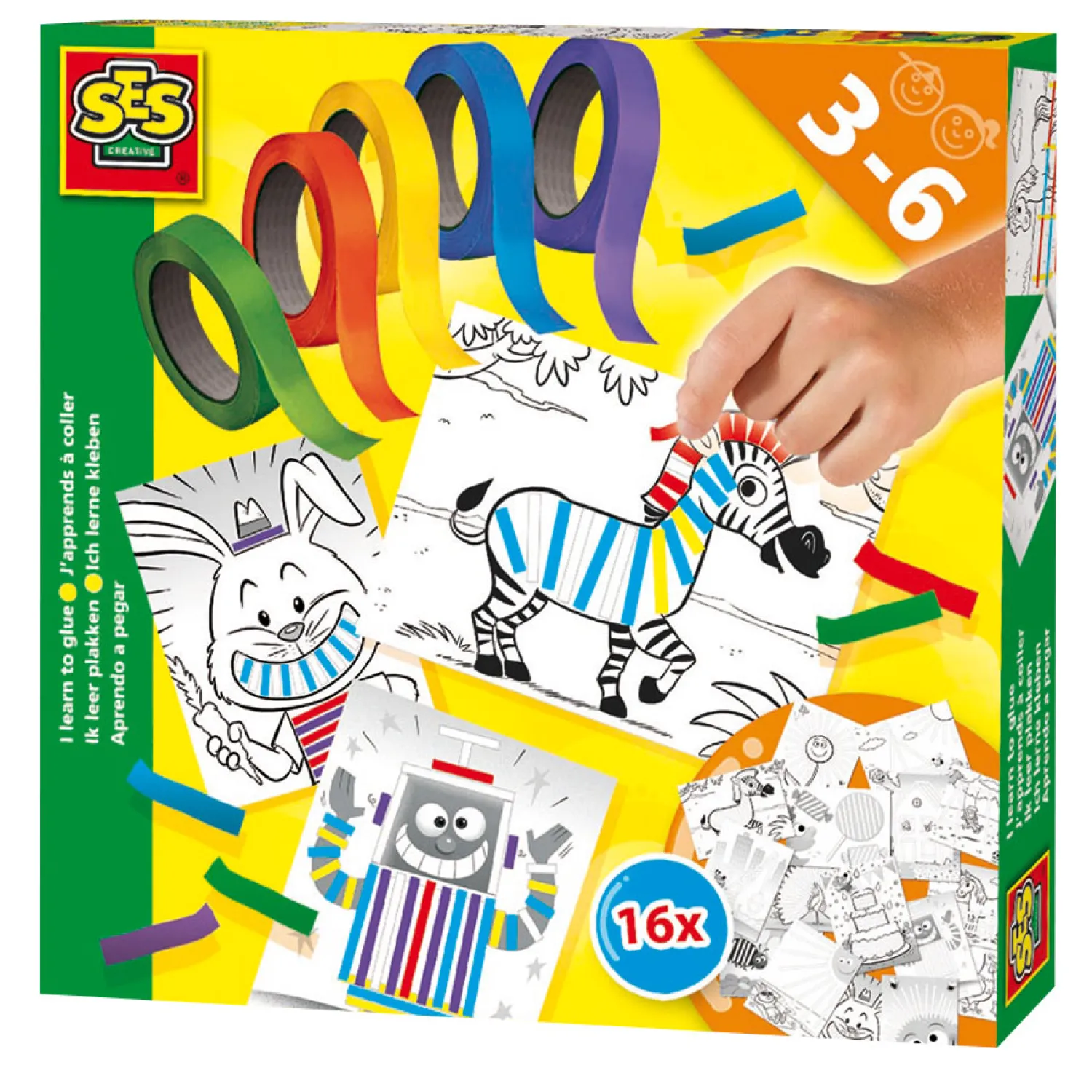 In de verpakking zitten maar liefst 16 voorbedrukte kaarten met leuke plakopdrachtjes en vijf rollen gekleurd plaktape. Veel plezier met plakken!
