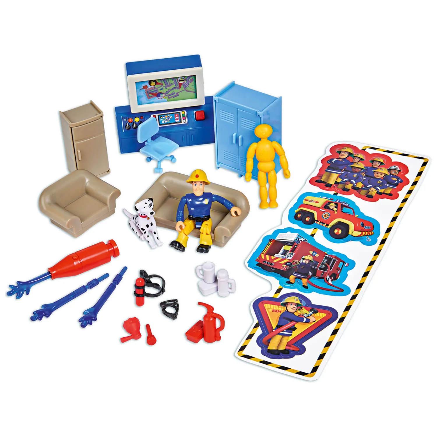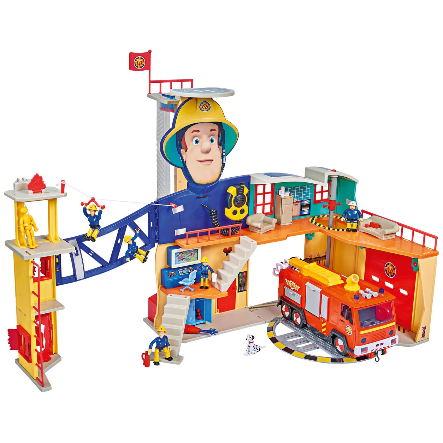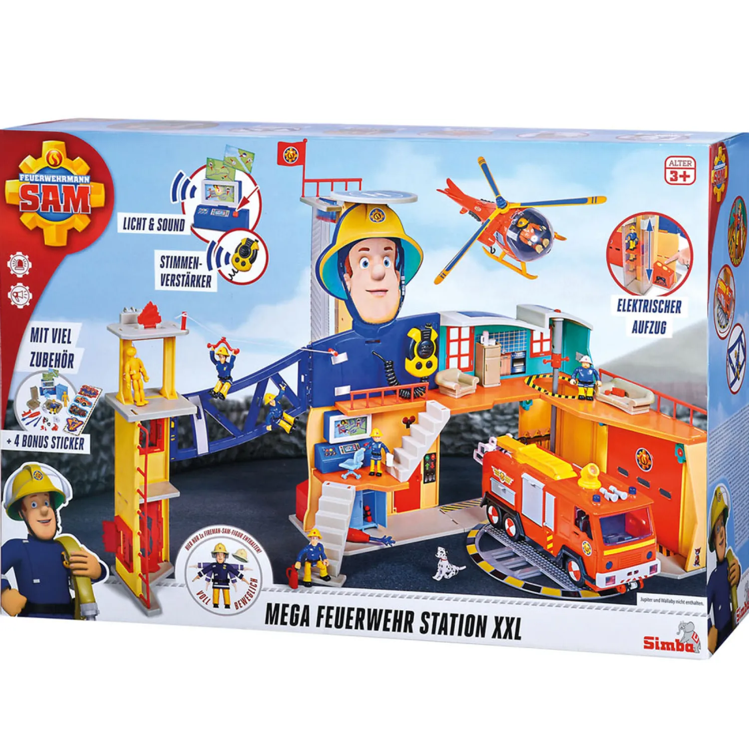 De Simba Toys Brandweerman Sam Mega Brandweerkazerne heeft licht- en geluidseffecten en wordt geleverd met een reeks accessoires, waaronder ‘Schnuffi’ de hond en een brandweerman Sam-figuur. Het is ontworpen voor kinderen van 3 jaar en ouder. Jupiter en Wallaby zijn apart verkrijgbaar. 5x 1,5 V R03 batterijen zijn inbegrepen.