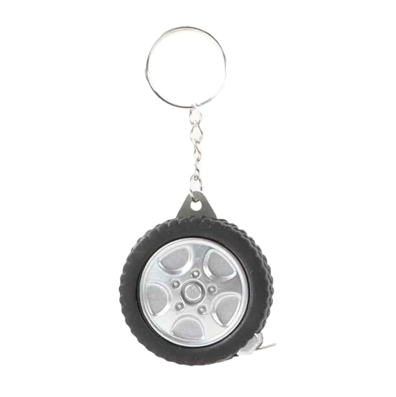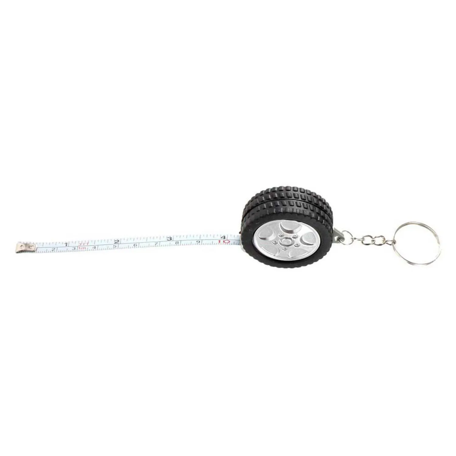De sleutelhanger is 4,5 centimeter groot, het meetlint is 1 meter lang.