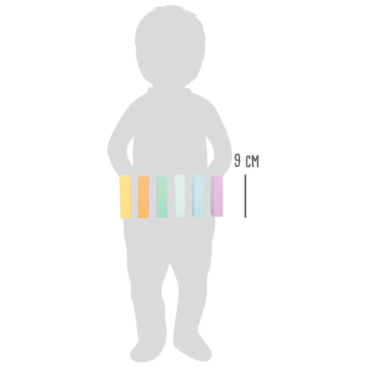 Afmetingen: blokjes ca. 3 x 3 x 3 cm; rechthoek ca. 9 x 3 x 1,5 cm. Geschikt voor kinderen vanaf 12 maanden oud.