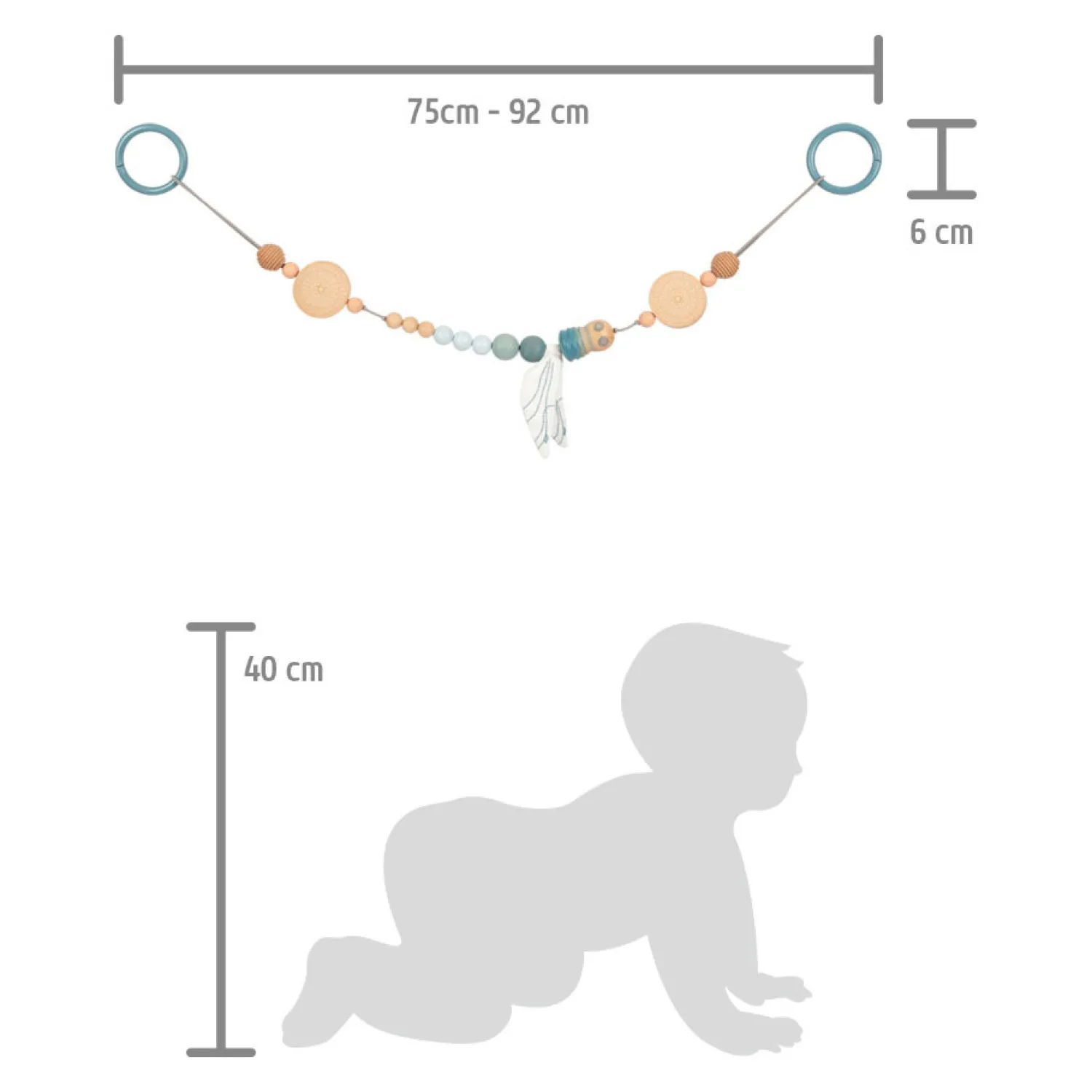 De push-lock punten op de bevestigingsringen zorgen voor een stevige bevestiging. De lengte van de kinderwagenketting is naar wens aan te passen, waardoor hij geschikt is voor kinderwagens van verschillende breedtes! De lengte kan aangepast worden door een van de balletjes te verplaatsen of de band in te korten, afhankelijk van welke lengte gewenst is. Het uiteinde van de elastische band is hoe dan ook elegant bedekt met een bolletje. Het is een ideaal cadeau voor een pasgeborene of een eerste set babyspullen die op speelse wijze de ontwikkeling van de visuele perceptie en het akoestische bewustzijn van de jonge baby bevordert.