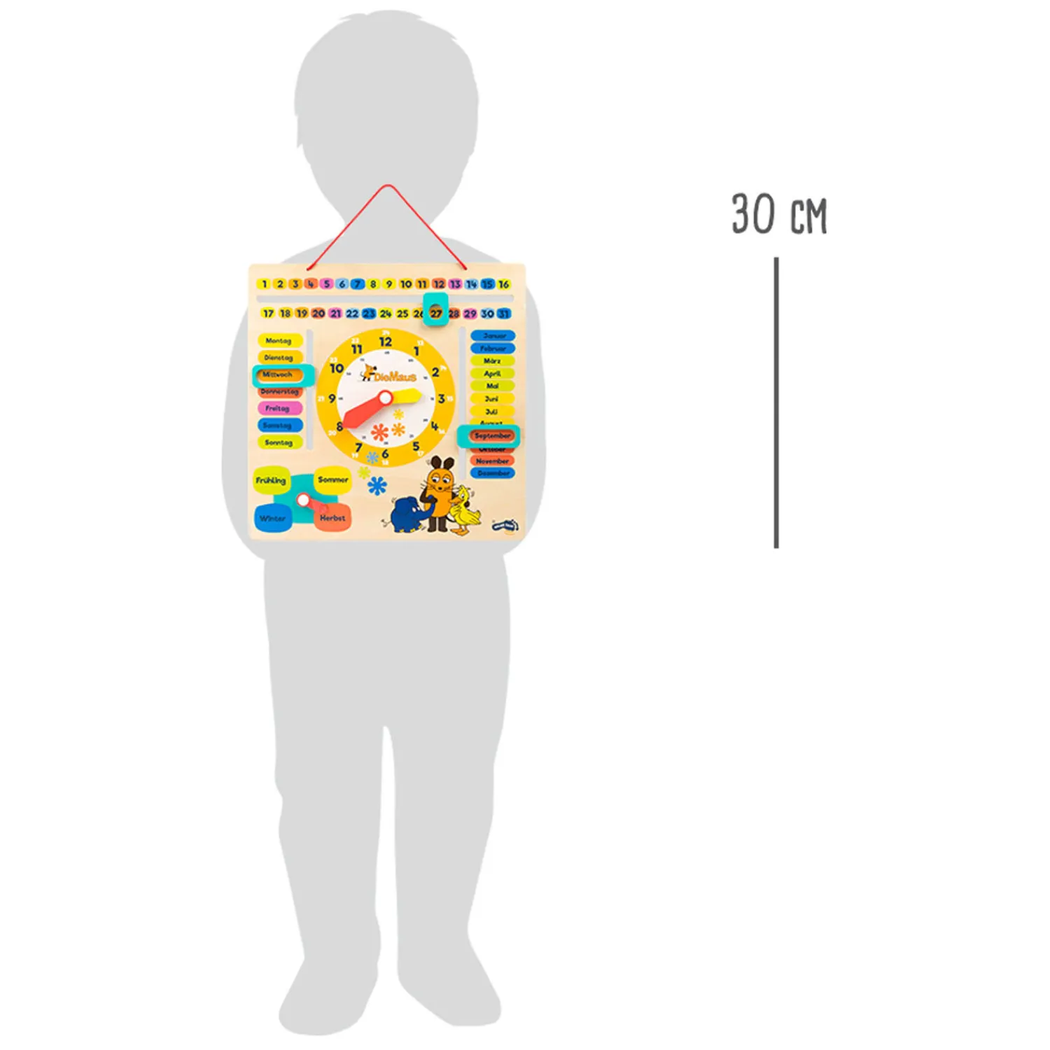 Alleen in de Duitse taal. Met schuifregelaars en pijlen zijn alle combinaties eenvoudig te selecteren. Wat leuk dat de muis, eend en olifant op het bord staan om te helpen! Een allround praktisch leerbord om alles te leren over het onderwerp tijd!