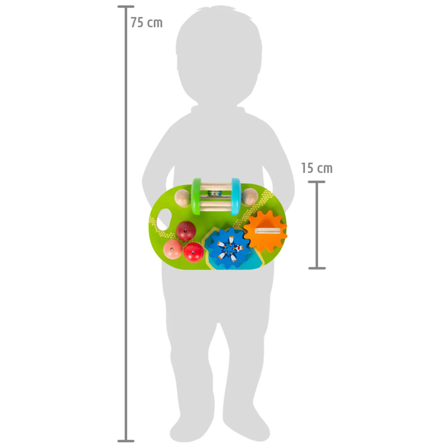 Gemaakt van robuust hout in heldere, mooie kleuren. Het activiteitenbord is 24 x 15 x 7,5 centimeter groot en geschikt voor kinderen vanaf 12 maanden oud.