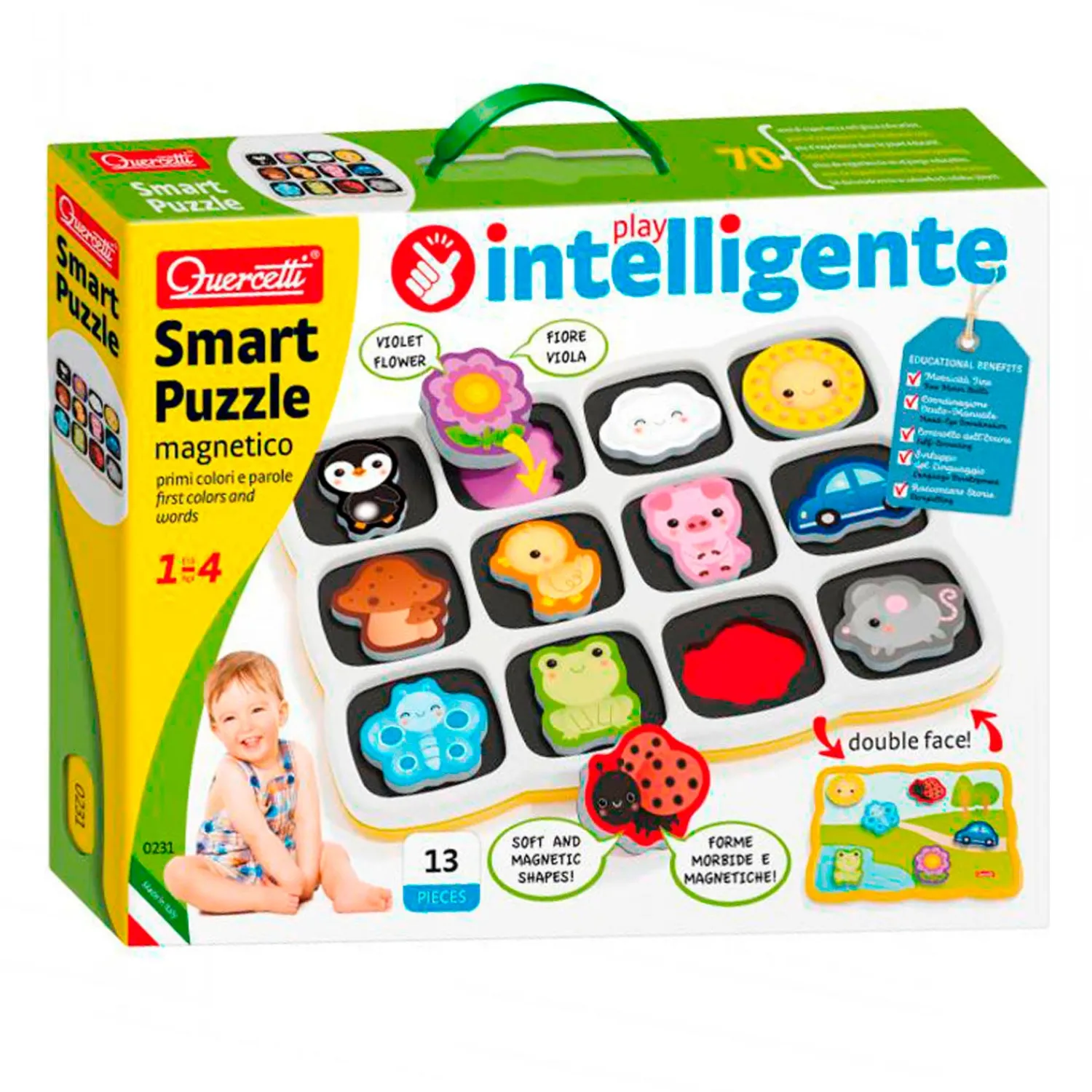 Deze magische dubbelzijdige puzzel houdt de puzzelstukjes zelf vast! De puzzelstukjes zijn van zacht materiaal wat kleine kinderen gemakkelijk kunnen oppakken. De schattige, herkenbare figuren van de stukjes, kunnen in de bijbehorende vakjes van de puzzel gestopt worden. Door de magneten, blijven de stukjes vanzelf hangen! Op de andere kant van het puzzelbord, staat een landschap afgebeeld. Ook hier kunnen de puzzelstukjes op blijven plakken door de magneten. Leuk én leerzaam, deze magnetische puzzel!