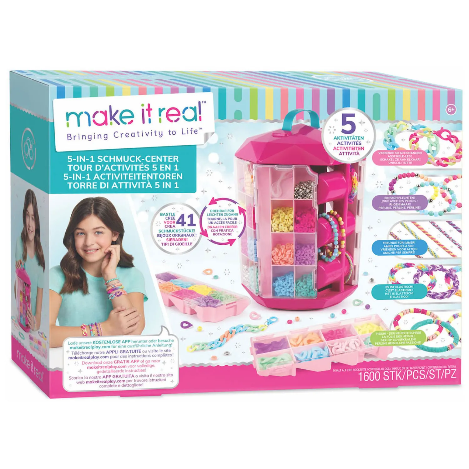 De armbandsets van Make it Real zijn geweldige cadeaus voor meisjes, tieners en tieners die van mode houden en genieten van knutselen en sieraden maken. Download de gratis ‘Make it Real’ app en ontdek de foto en video instructies, adviezen van professionele influencers, een forum om ideeën te delen met vrienden over de hele wereld! Afmeting verpakking: 37x10x27 cm (lxdxh). Leeftijdsindicatie: 6 jaar+.