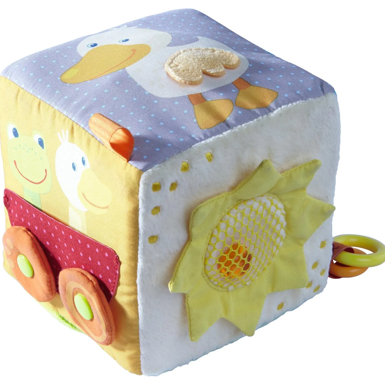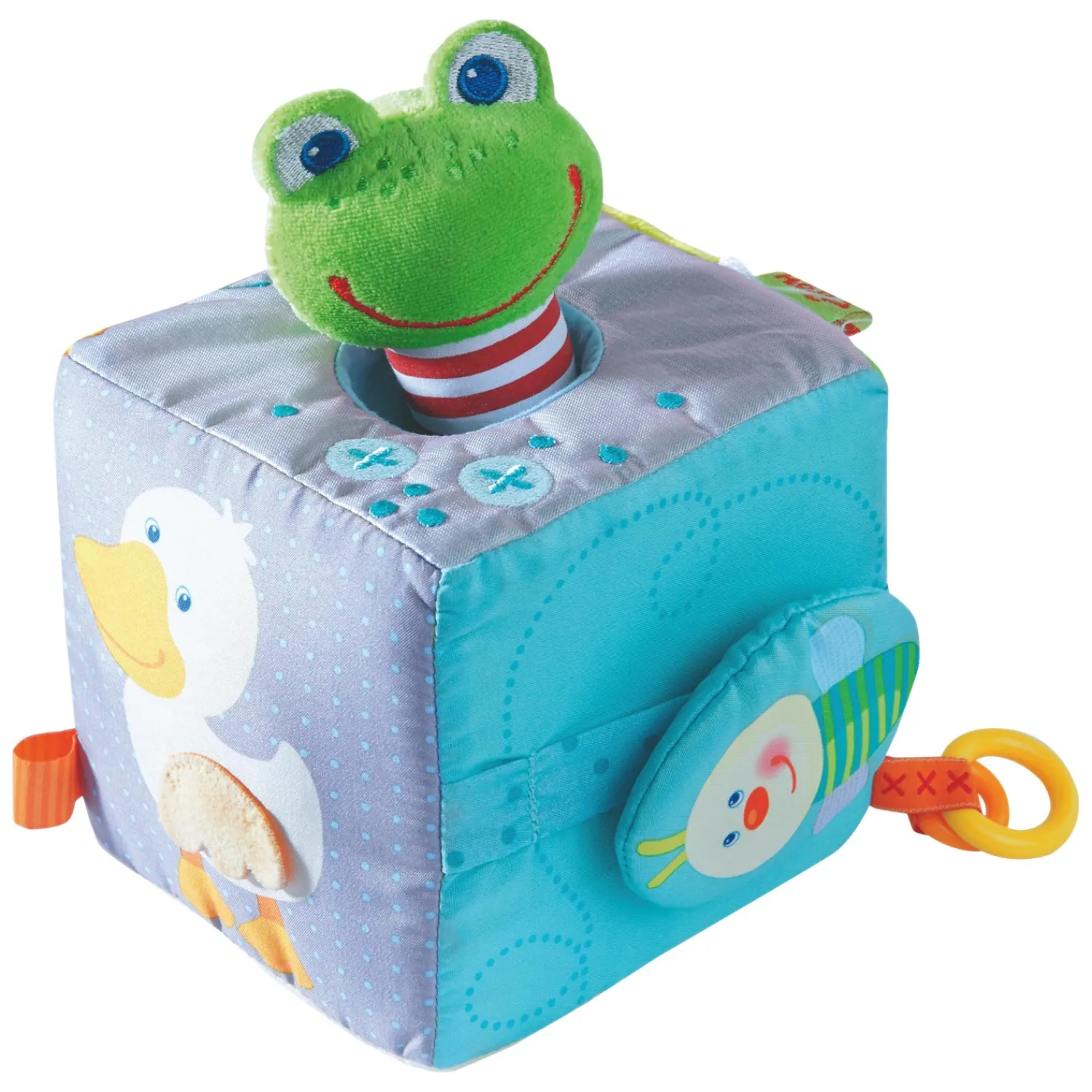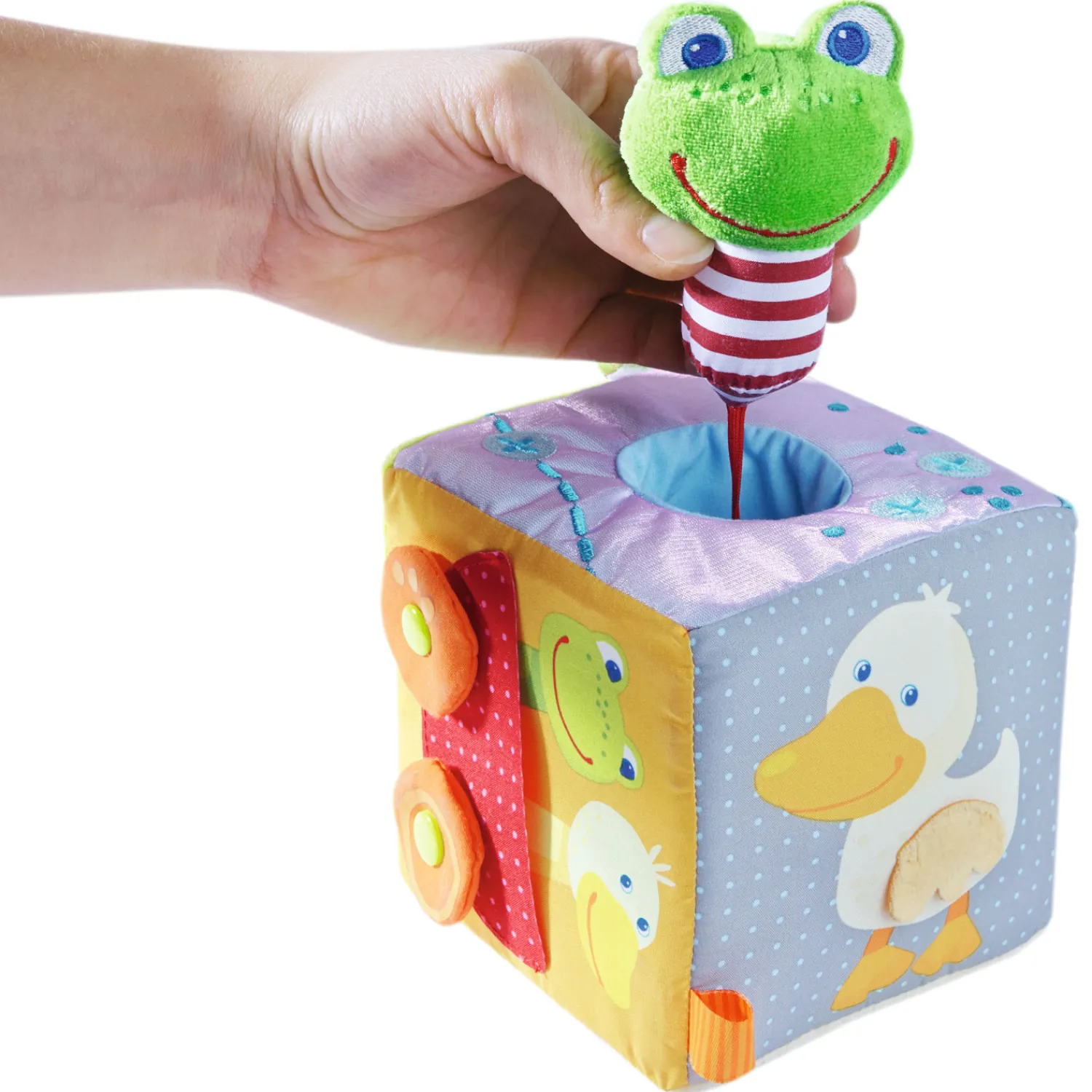 Hier valt veel te ontdekken: de wielen van de auto kunnen draaien, in de buik van de eend zit een pieper verstopt en de kleine Toverkikker springt vrolijk terug, als je hem uit de kubus trekt en loslaat.