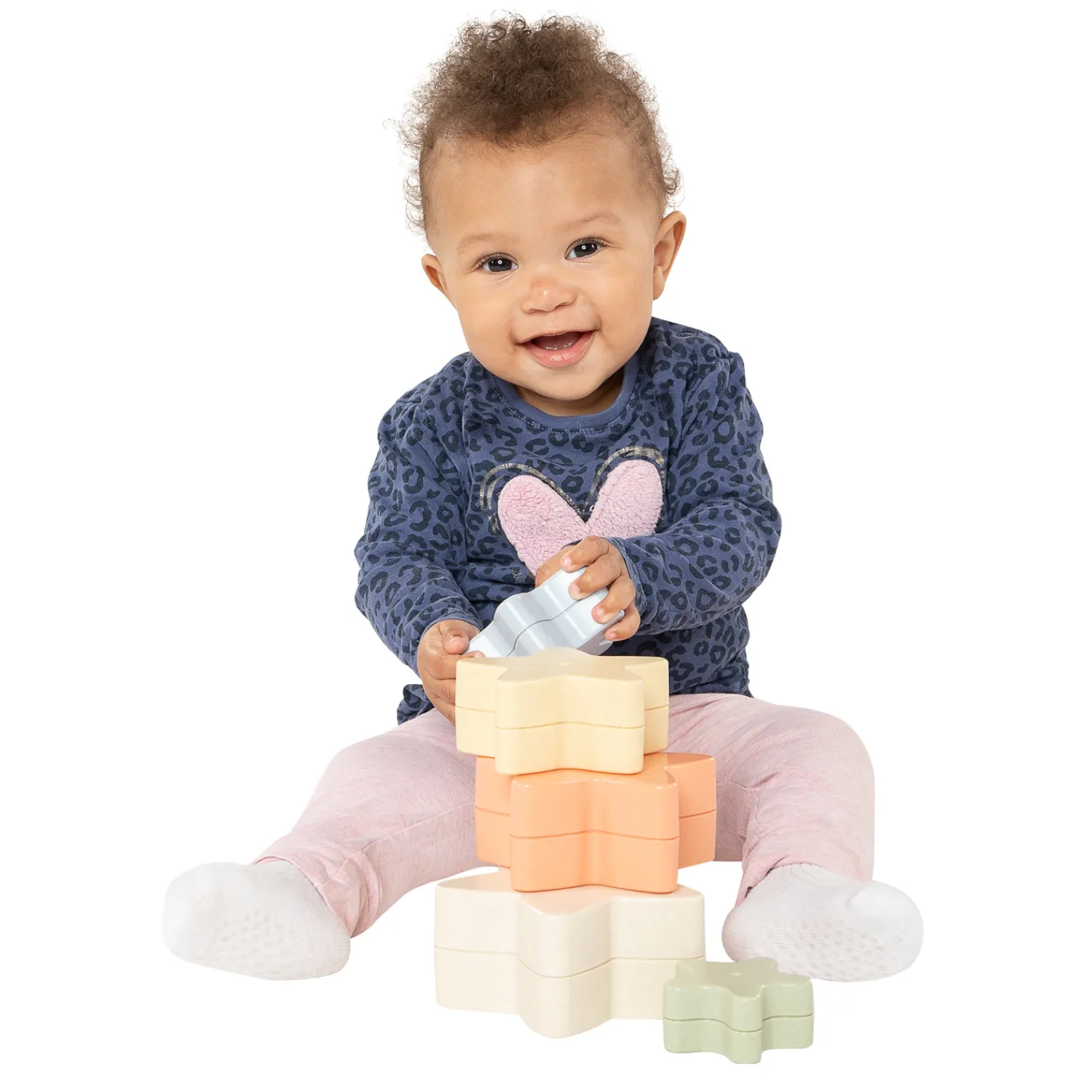 Set van 5 pastelkleurige stapelsterren van kunststof. De sterren hebben elk een ander formaat, variërend van 12 cm tot 6,3 centimeter. Geschikt voor kinderen vanaf 6 maanden oud.