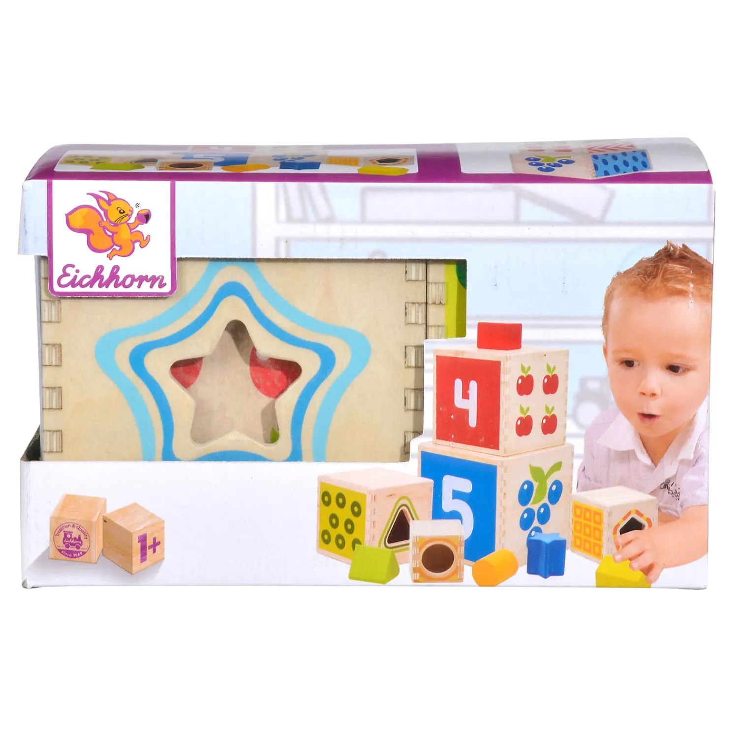 Deze houten Eichhorn stapeltoren is niet alleen een stapeltoren, maar ook gelijk een vormenstoof waardoor kinderen ook de vormen en kleuren leren. Op iedere blok staat verder een cijfer afgebeeld waardoor kinderen ook leren tellen. Verder staan er afbeeldingen van fruit en patronen op. De stapeltoren heeft een totale hoogte van 40 cm.