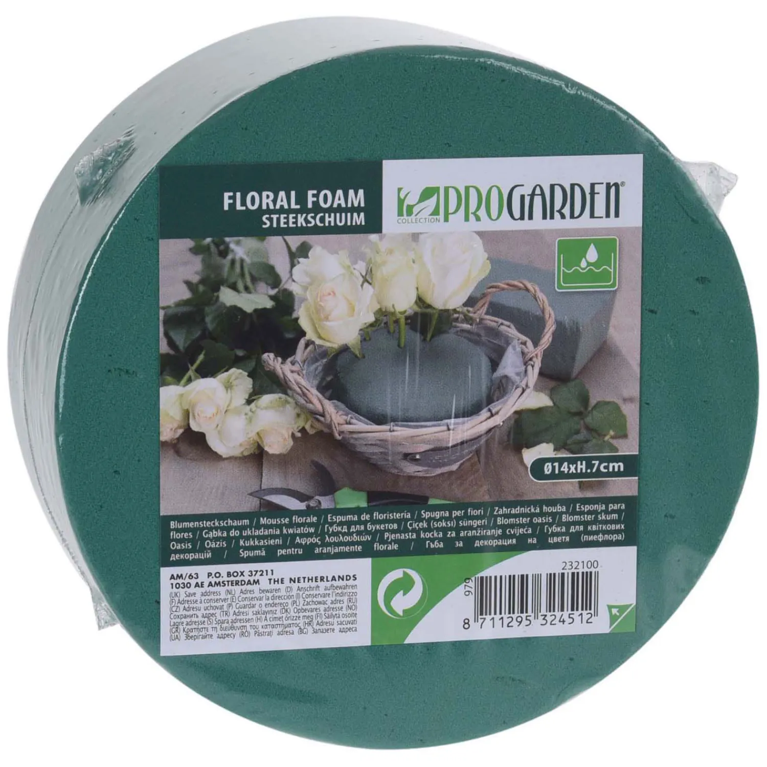 Cilindervormig blok steekschuim voor bloemen en andere groenwerken. Het ronde blok heeft een doorsnede van 14 centimeter en is 7,5 centimeter groot.