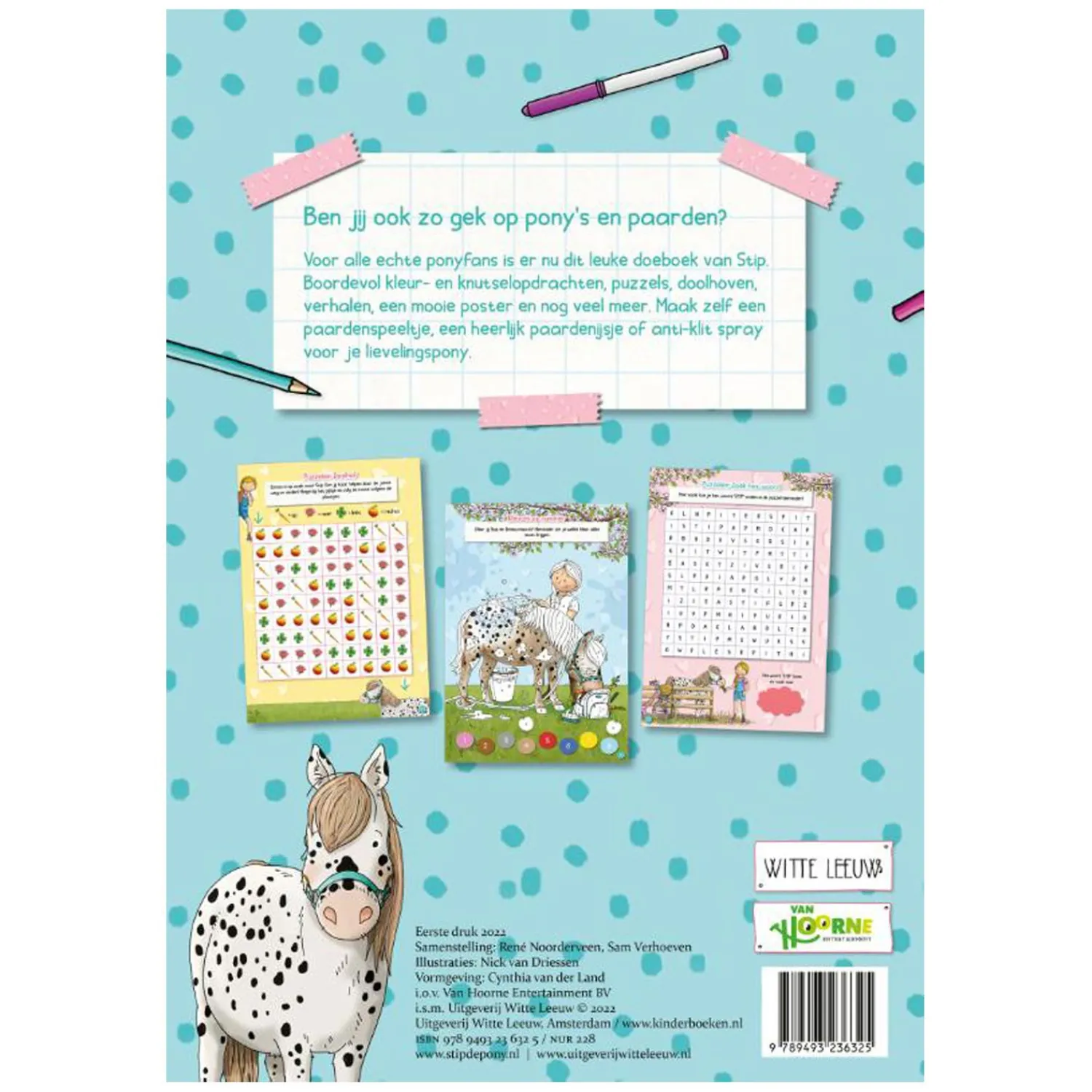 Voor alle echte ponyfans is er nu dit leuke doeboek van Stip. Boordevol leuke kleur- en knutselopdrachten, puzzels, doolhoven, verhalen, recepten voor jouw lievelingspony en nog veel meer. Maak een ponytaart of echte paardenshampoo. Een must have voor echte ponyfans!