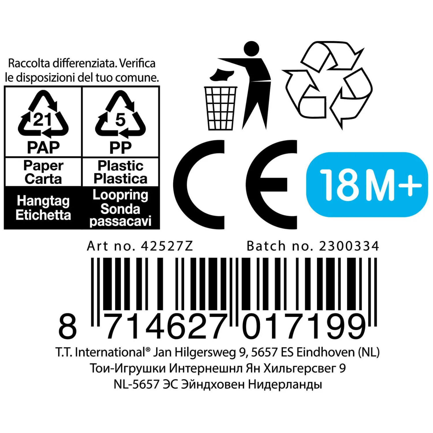 - Waarschuwing: Niet geschikt voor kinderen onder de 3 jaar ivm kleine onderdelen.