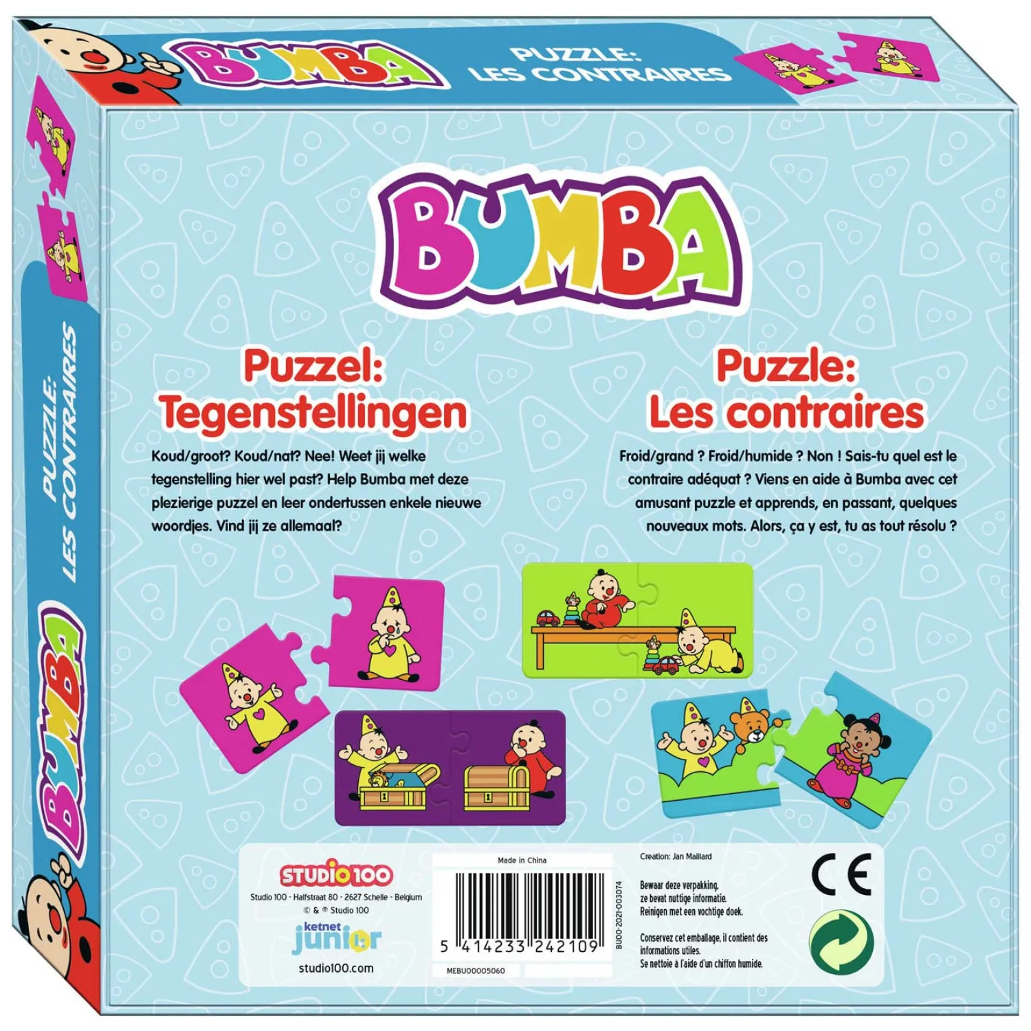 Deze 10in1 Bumba puzzels zijn superleuk! De puzzels bestaan allemaal uit 2 stukjes, met verschillende kleuren achtergronden en allerlei verschillende afbeeldingen van Bumba en zijn vriendjes. Elk stukje is een tegenstelling van het andere stukje, blij en verdrietig, op en onder, open en dicht. Vind jij alle stukjes bij elkaar?