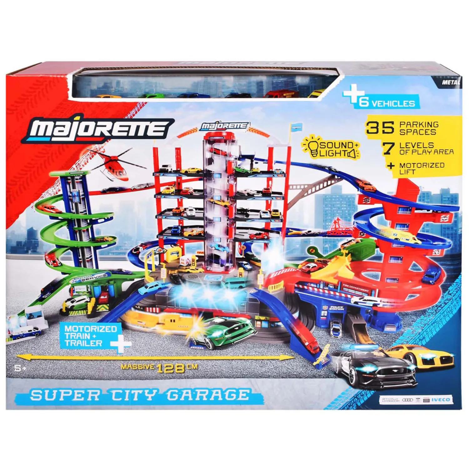 De garage is supergroot: 128 cm lang, 78 cm breed en 73 cm hoog. De gemotoriseerde spiraallift brengt jouw auto’s in een paar seconden helemaal naar boven, en met de automatische oprit rijden de wagens zelf de lift in. De garage heeft spannende details zoals bruggen, verkeerslichten, wegversperringen en bewegende delen. Ook de trein met wagon rijdt vrolijk door de garage en maakt het speelplezier compleet!