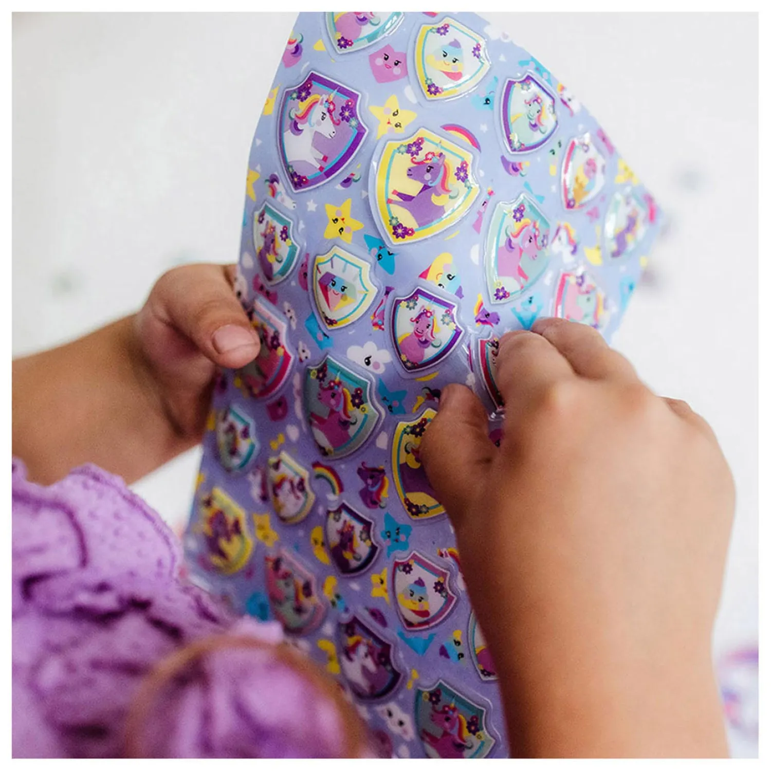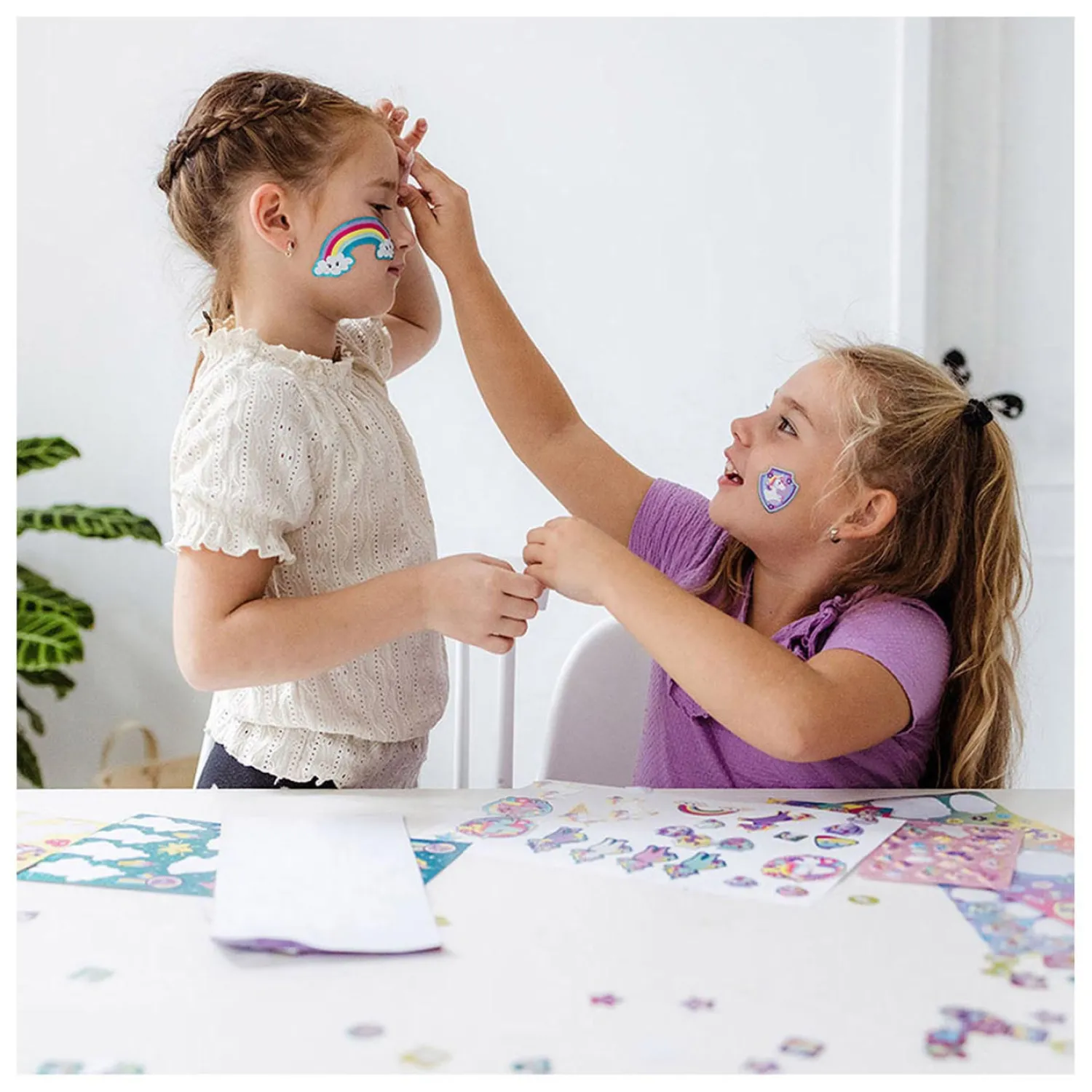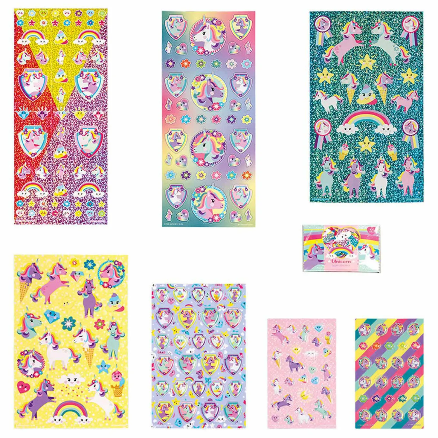 • 7 stickervellen verschillende formaten stickers van eenhoorns, regenbogen, bloemen en nog veel meer, waaronder: