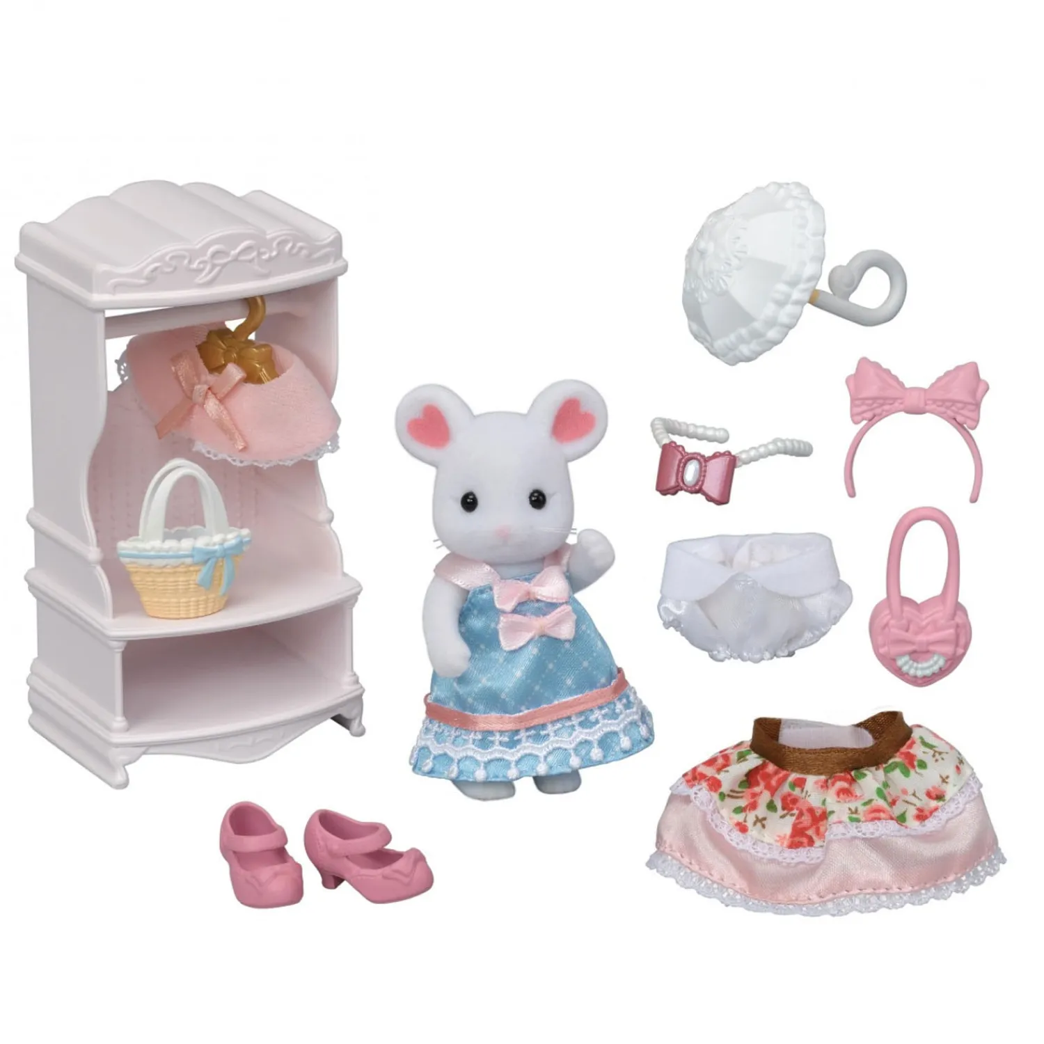 Grote zus marshmallow muis, blouse, rok, cape, parasol, pumps, ketting, haarband, handtas, mand, kledinghanger, kledingrek (in totaal 12 onderdelen)