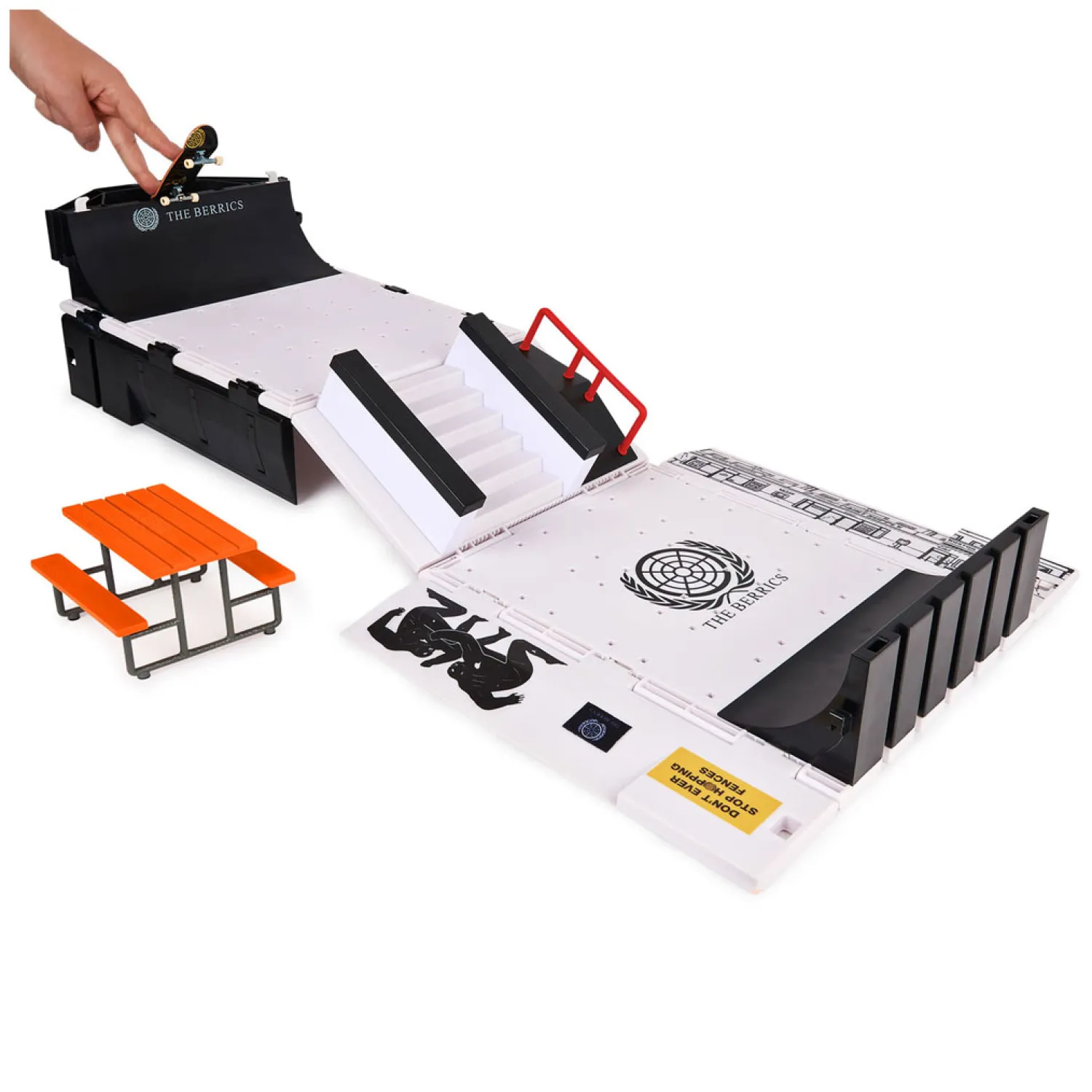 Inhoud: 1 Tech Deck-fingerboard, 1 transformerende basis, 2 Hubba-ledges, 1 trap, 2 roll-in rampen, 1 gemonteerde ramp, 1 picknicktafel, 1 rail, 6 x-verbindingsstukken, 1 stuur, 2 stickervellen, 6 x-verbindingsstukken, 6 X-Connect-afdekkingen, 1 gebruiksaanwijzing