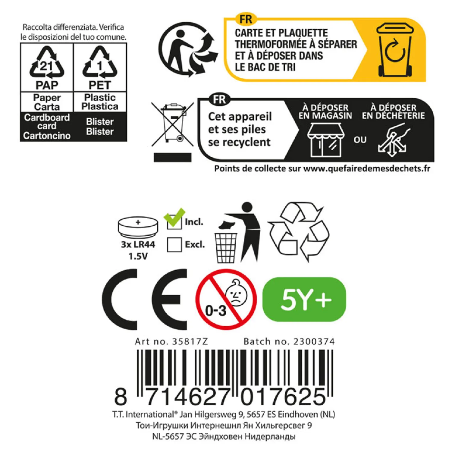 Geschikt vanaf 3 jaar. Inclusief 3 knoopcelbatterijen.Prijs per stuk, verschillende uitvoeringen/kleuren worden door elkaar geleverd.