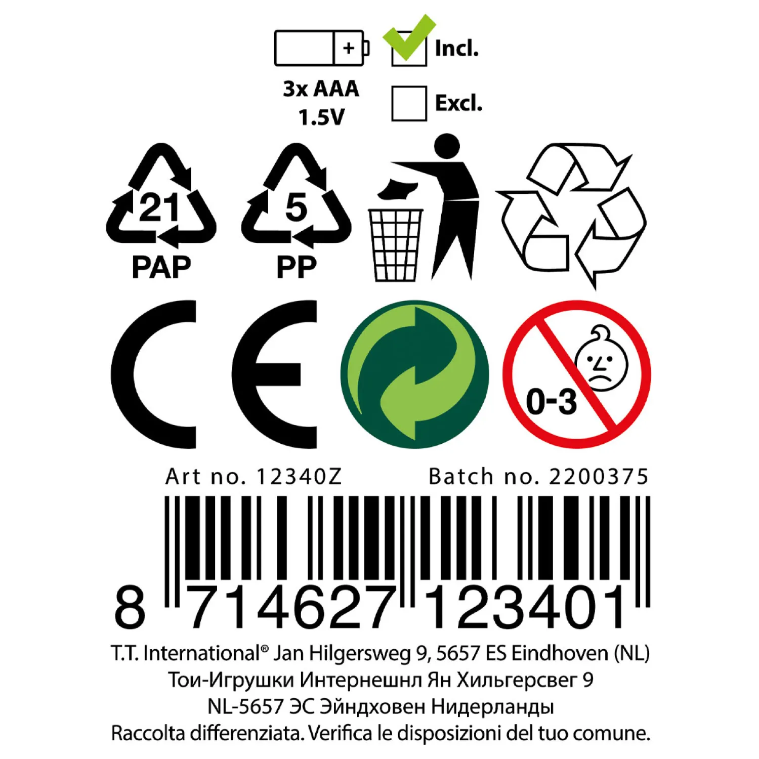 - Waarschuwing: Niet geschikt voor kinderen onder de 3 jaar ivm kleine onderdelen.