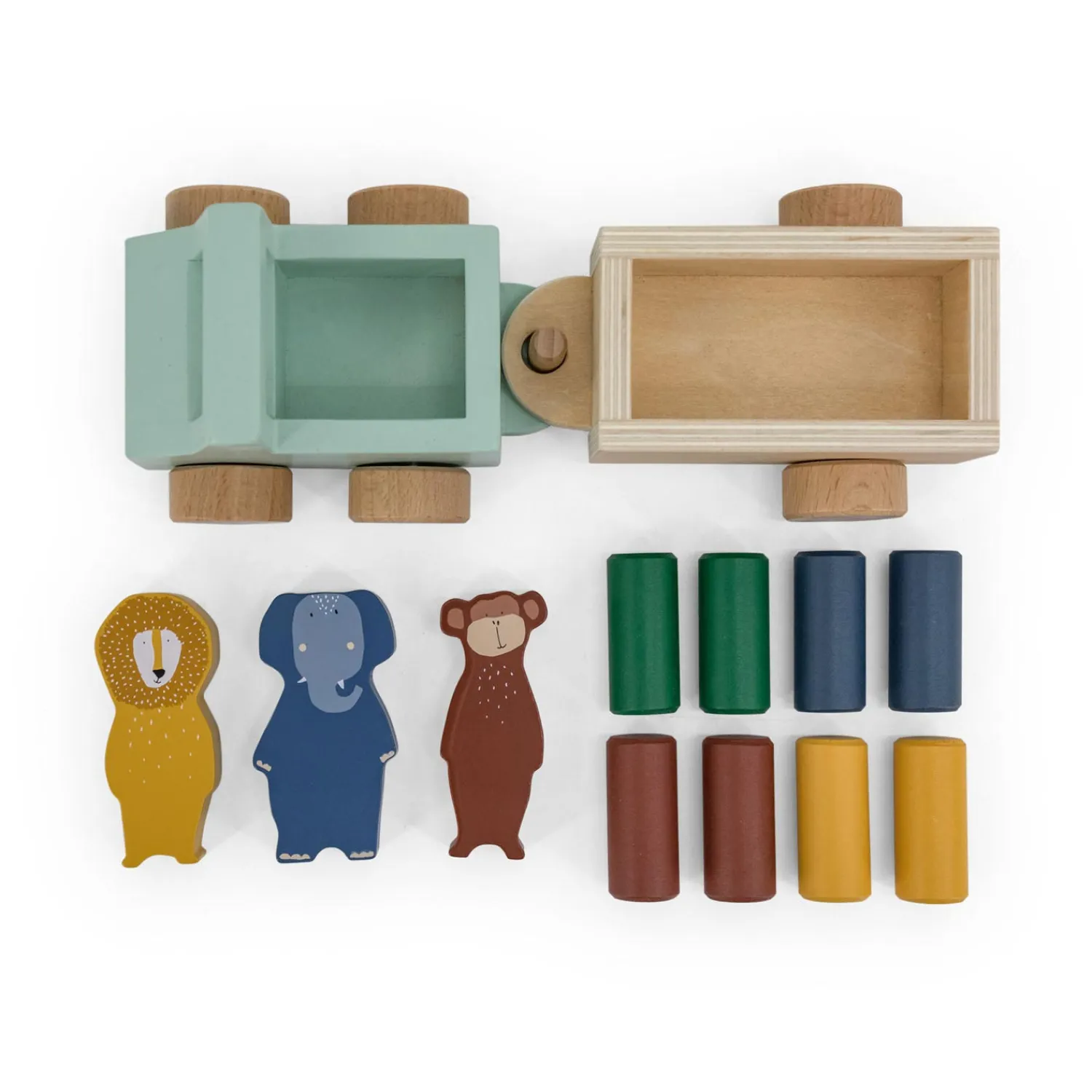 Drie dierenvrienden hebben samen zes gekleurde stammen in hun aanhangwagen geladen en zijn klaar om te vertrekken! Je kan de aanhangwagen loskoppelen, alle gekleurde stammen en dieren eruit halen voor eindeloos veel speelpret. Een geweldige set om kinderen hun fantasie te prikkelen! De auto met aanhangwagen is gemaakt van 100% FSC © gecertificeerd hout. Alle verven zijn op waterbasis en veilig voor baby’s.