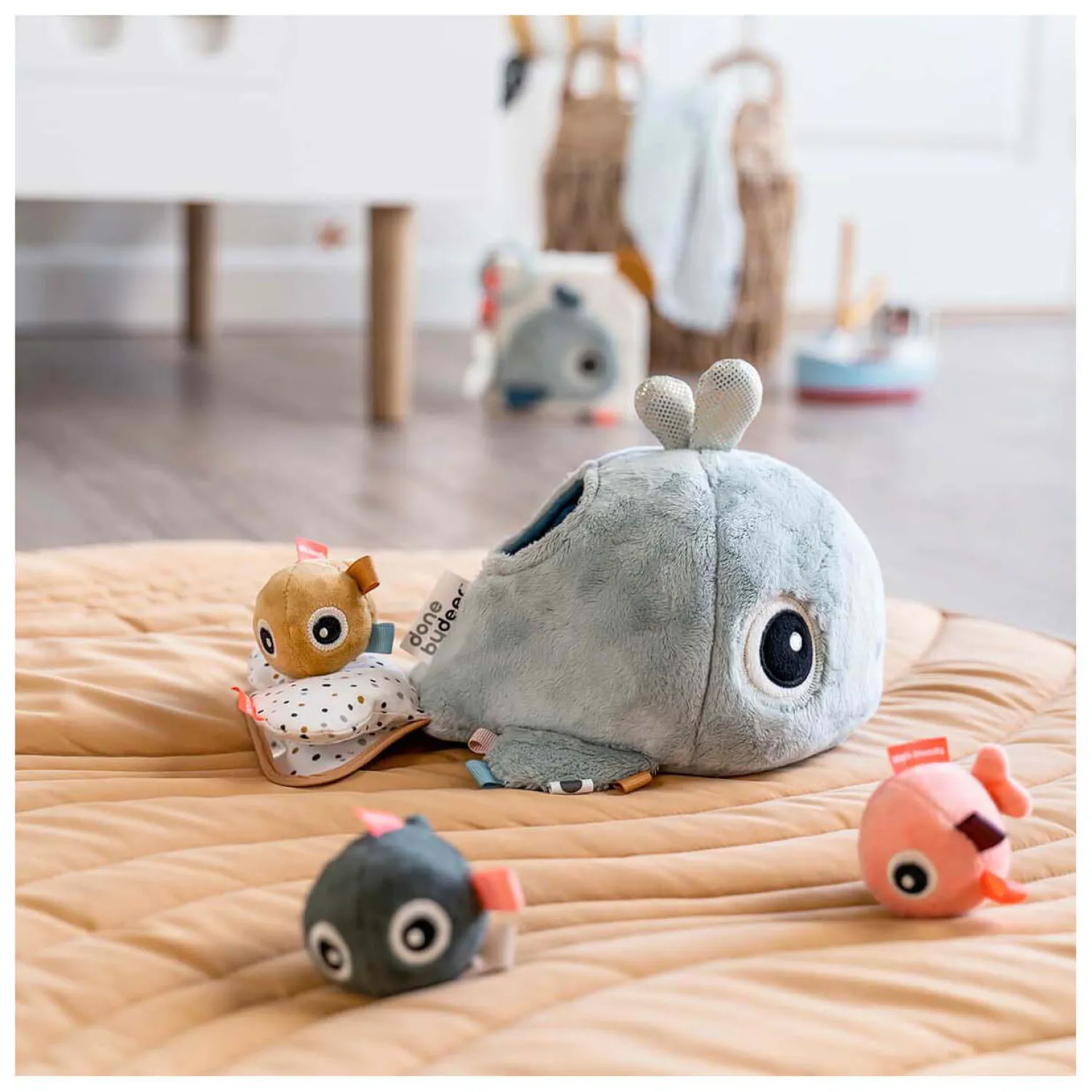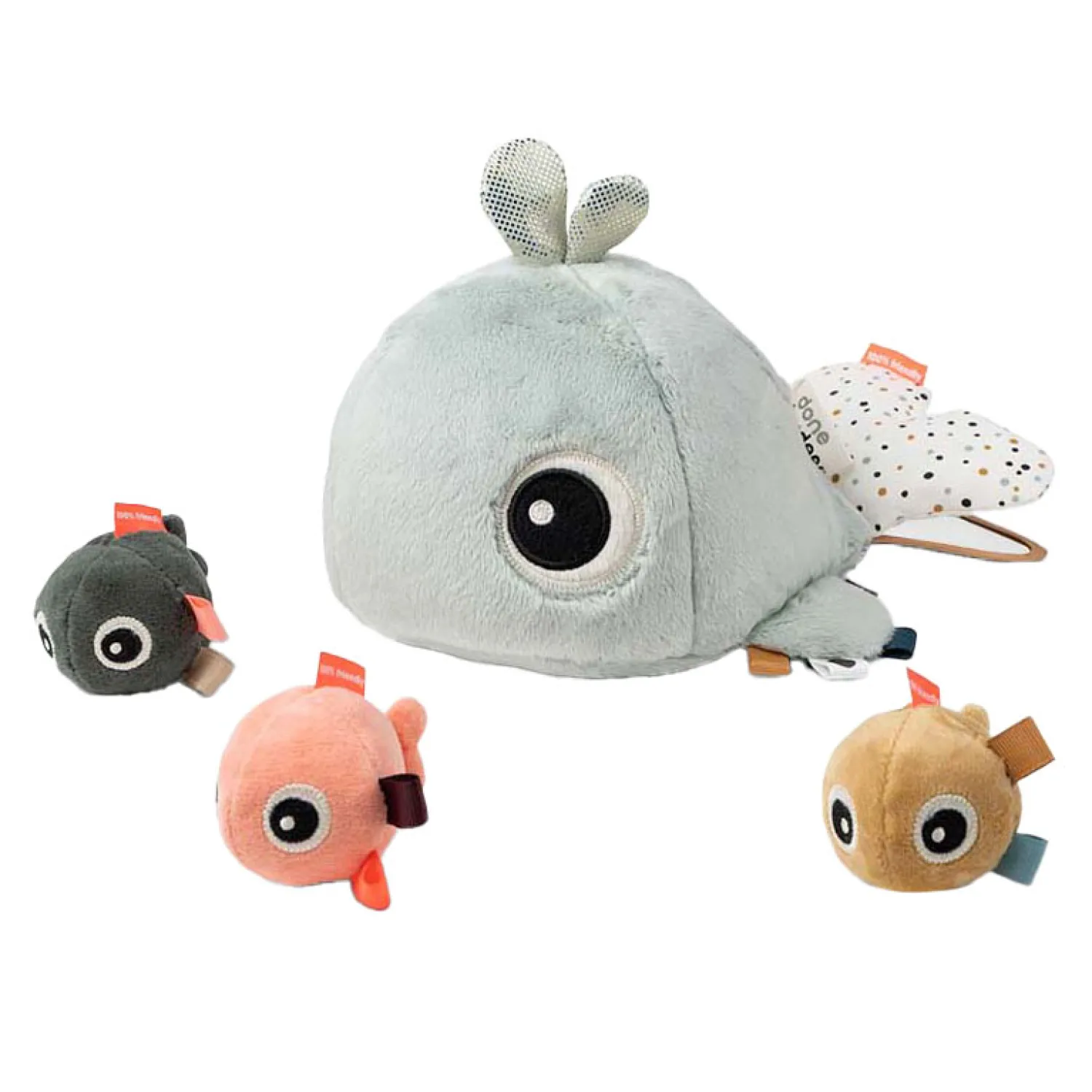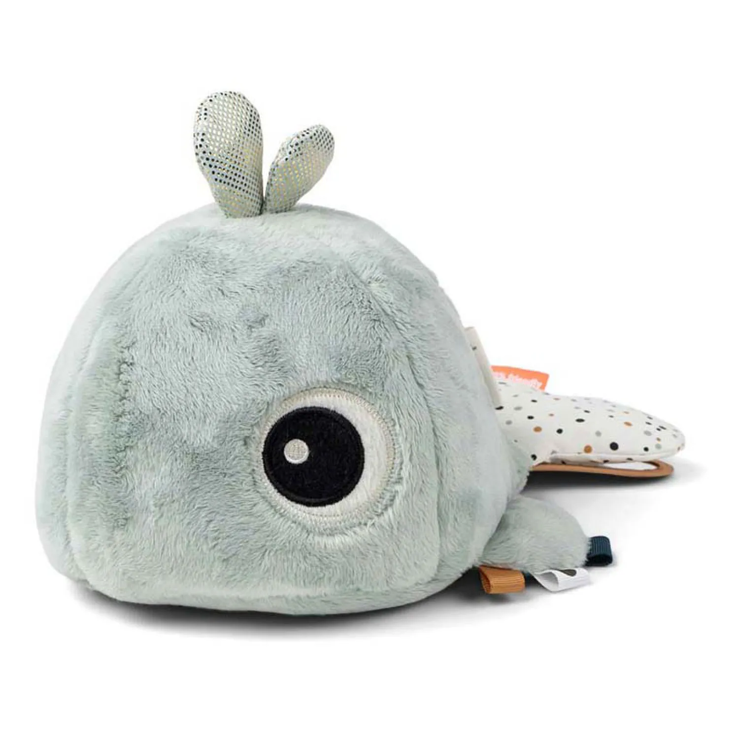 • Mooie blauwe kleuren en verschillende texturen op de schattige walvis stimuleren de zintuigen van uw kind